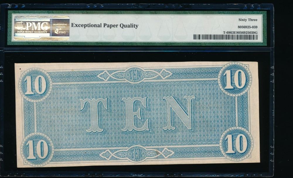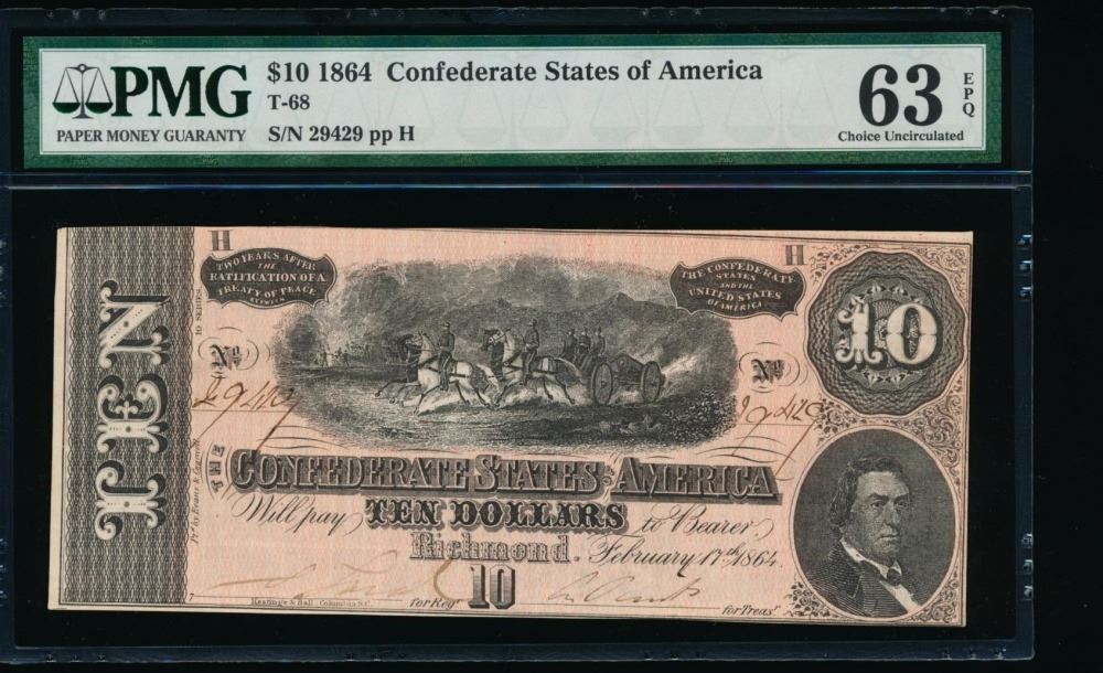 One 1864 $10 Confederate States of America Note PMG 63EPQ.