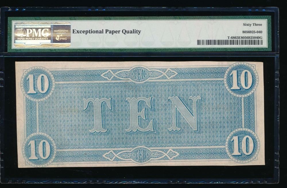One 1864 $10 Confederate States of America Note PMG 63EPQ.