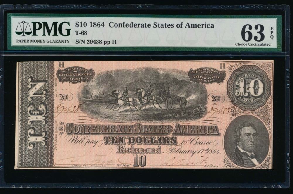 One 1864 $10 Confederate States of America Note PMG 63EPQ.