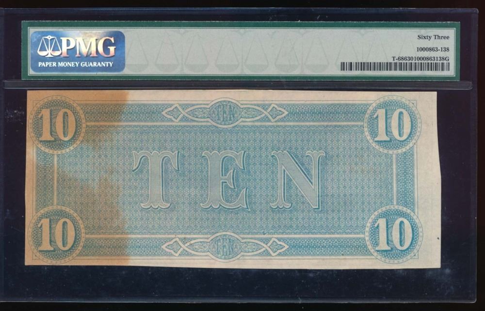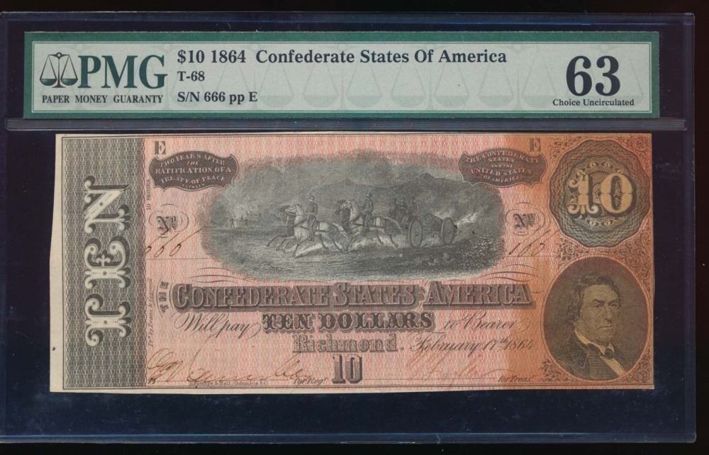 One 1864 $10 Confederate States of America Note PMG 63.