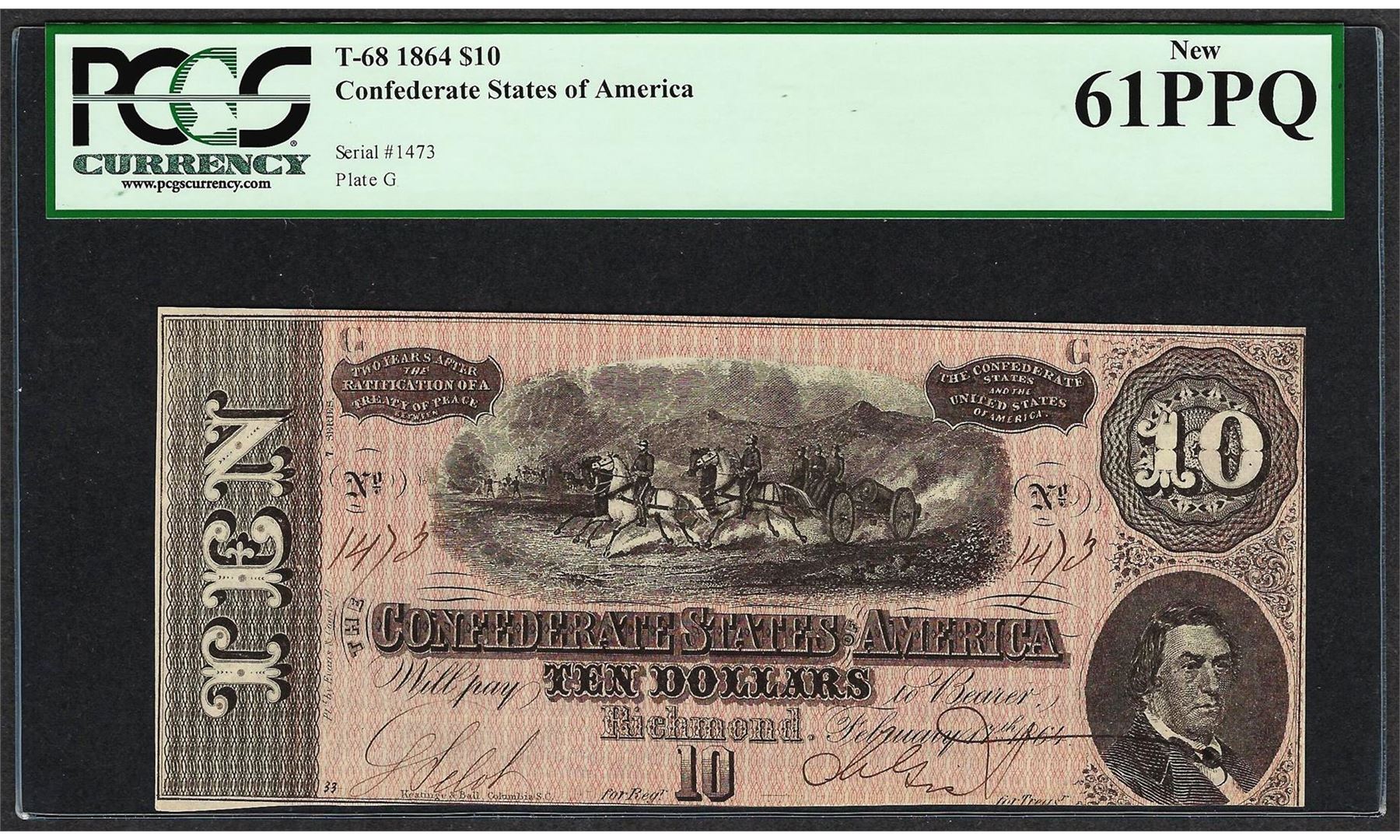 One 1864 $10 Confederate States of America Note T-68 PCGS New 61PPQ. PCGS Graded.