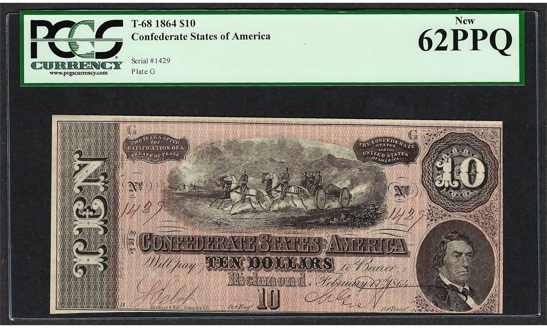 One 1864 $10 Confederate States of America Note T-68 PCGS New 62PPQ. PCGS Graded.