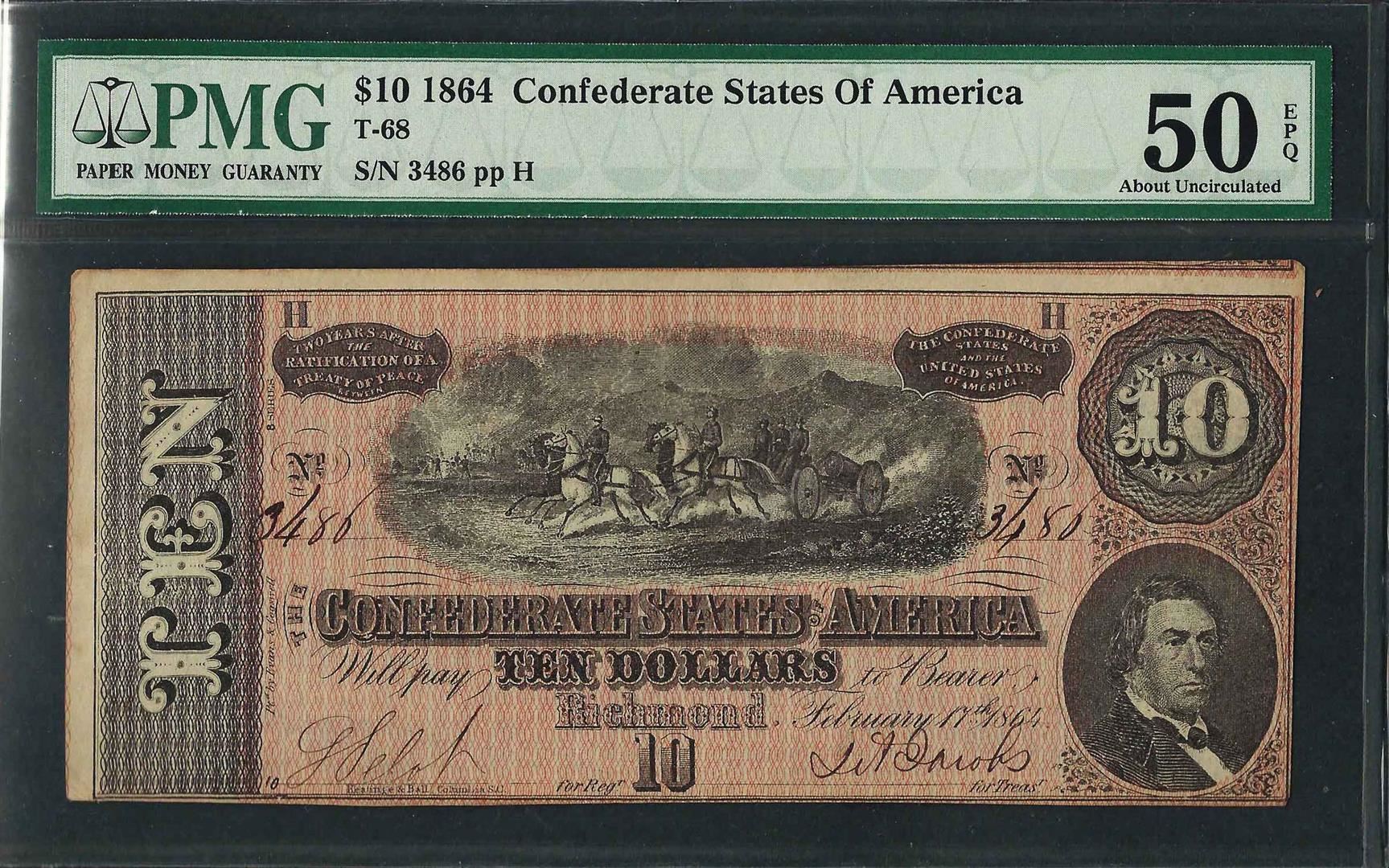 1864 $10 Confederate States of America Note T-68 PMG About Uncirculated 50EPQ