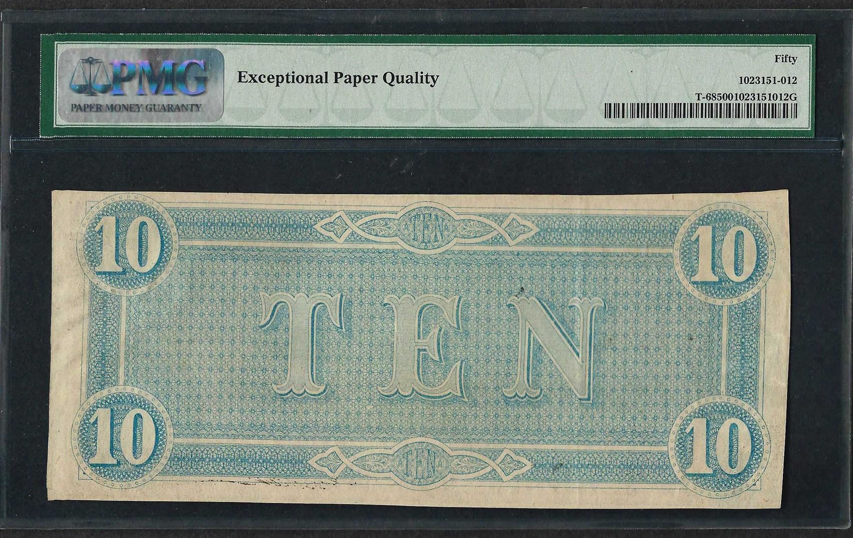 1864 $10 Confederate States of America Note T-68 PMG About Uncirculated 50EPQ
