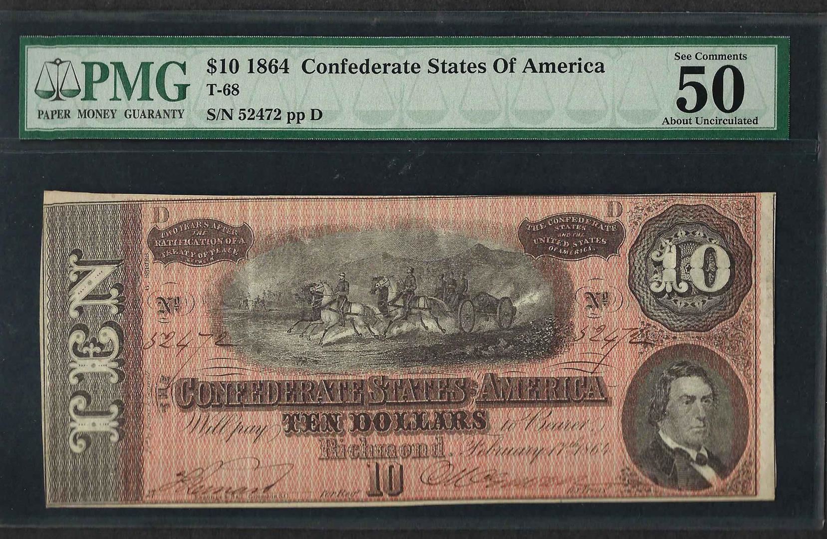 1864 $10 Confederate States of America Note T-68 PMG About Uncirculated 50EPQ