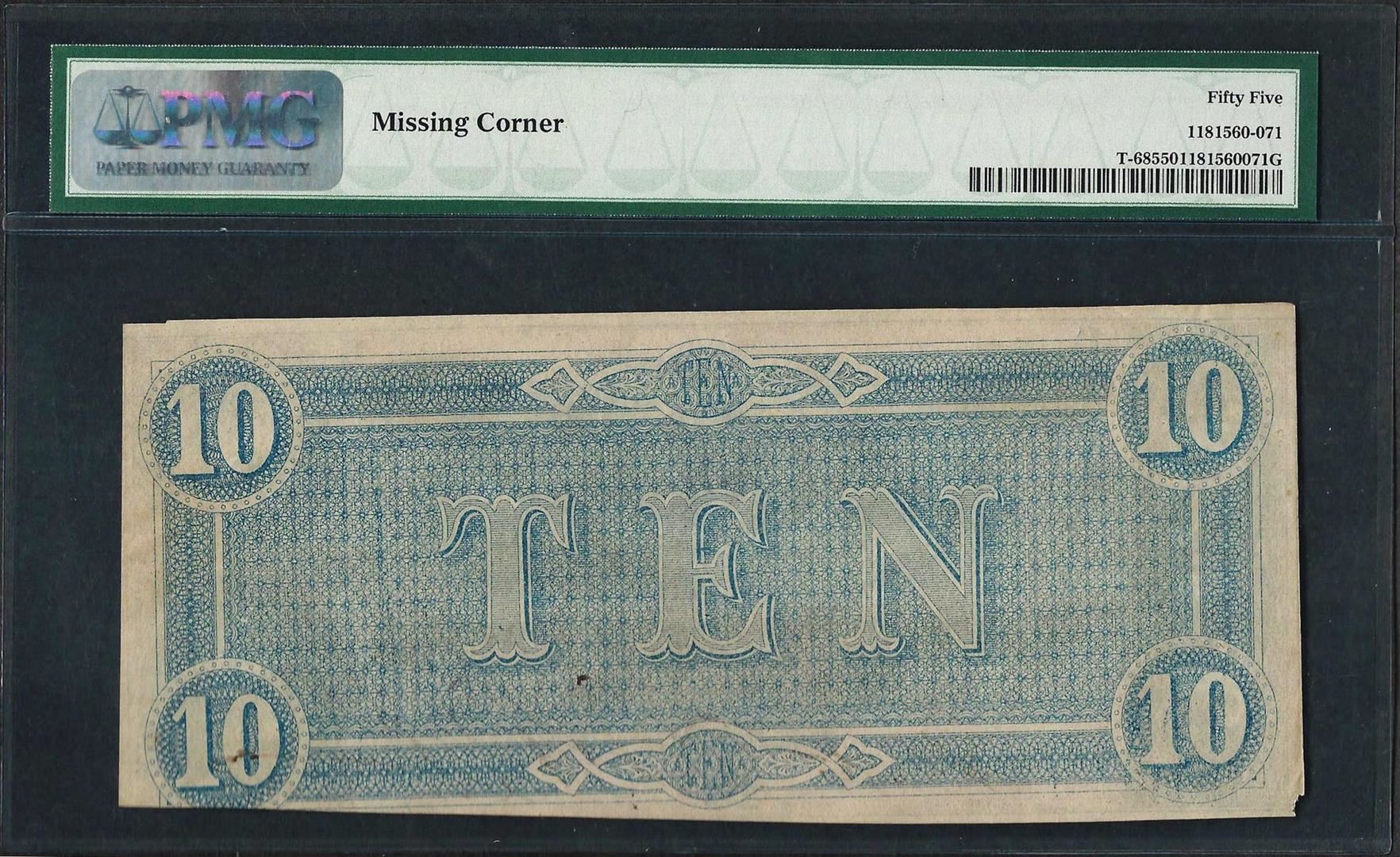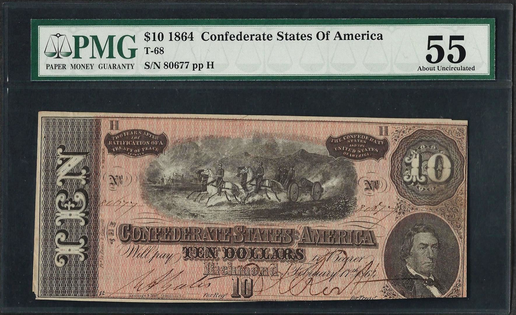One 1864 $10 Confederate States of America Note T-68 PMG About Uncirculated 55. PMG Certified.