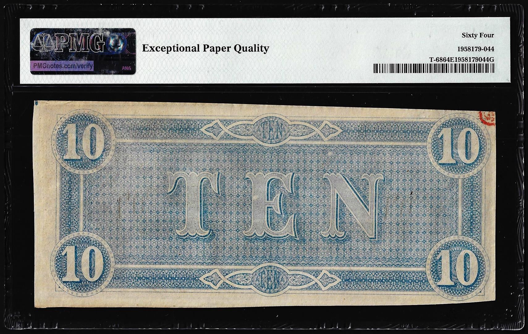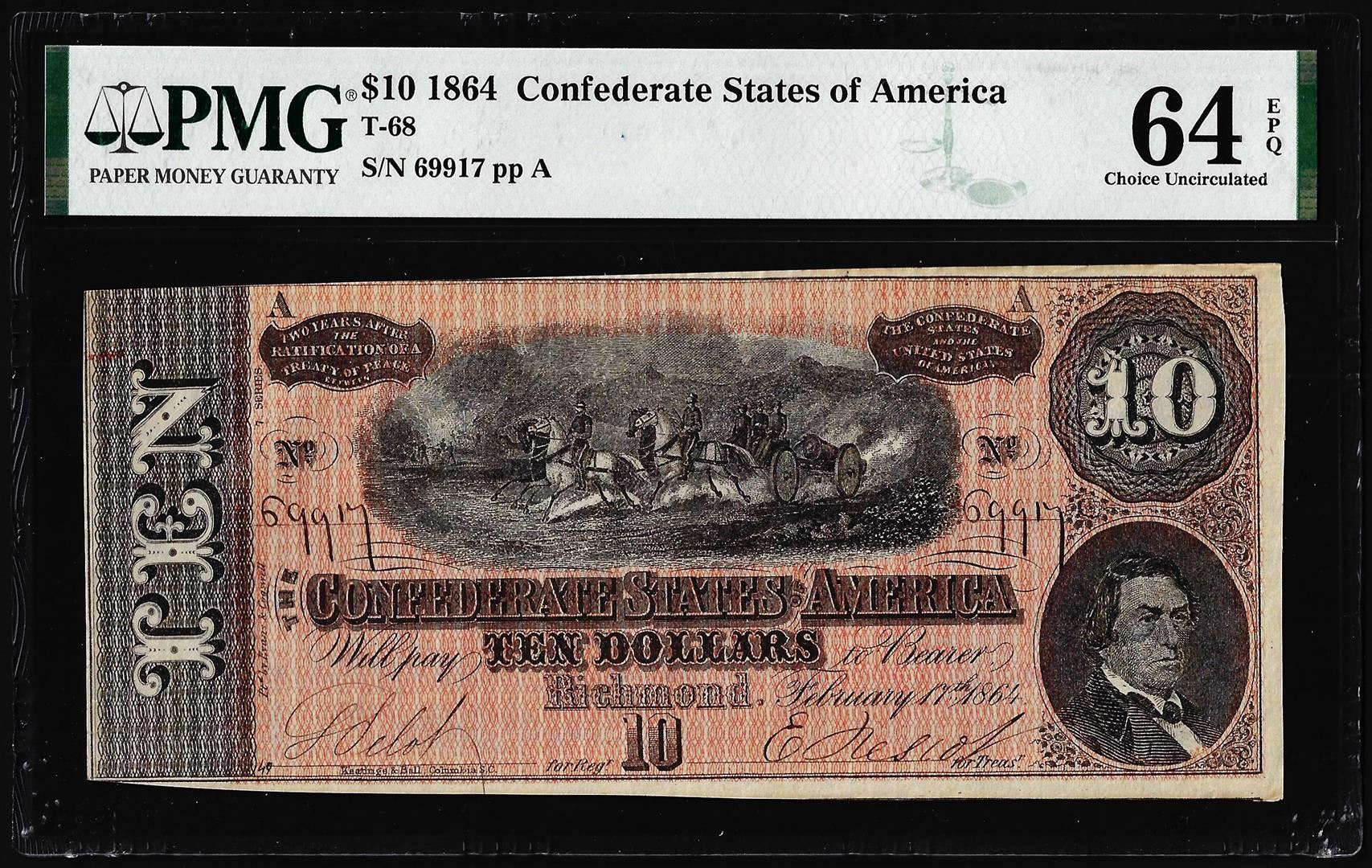 1864 $10 Confederate States of America Note T-68 PMG Choice Uncirculated 64EPQ