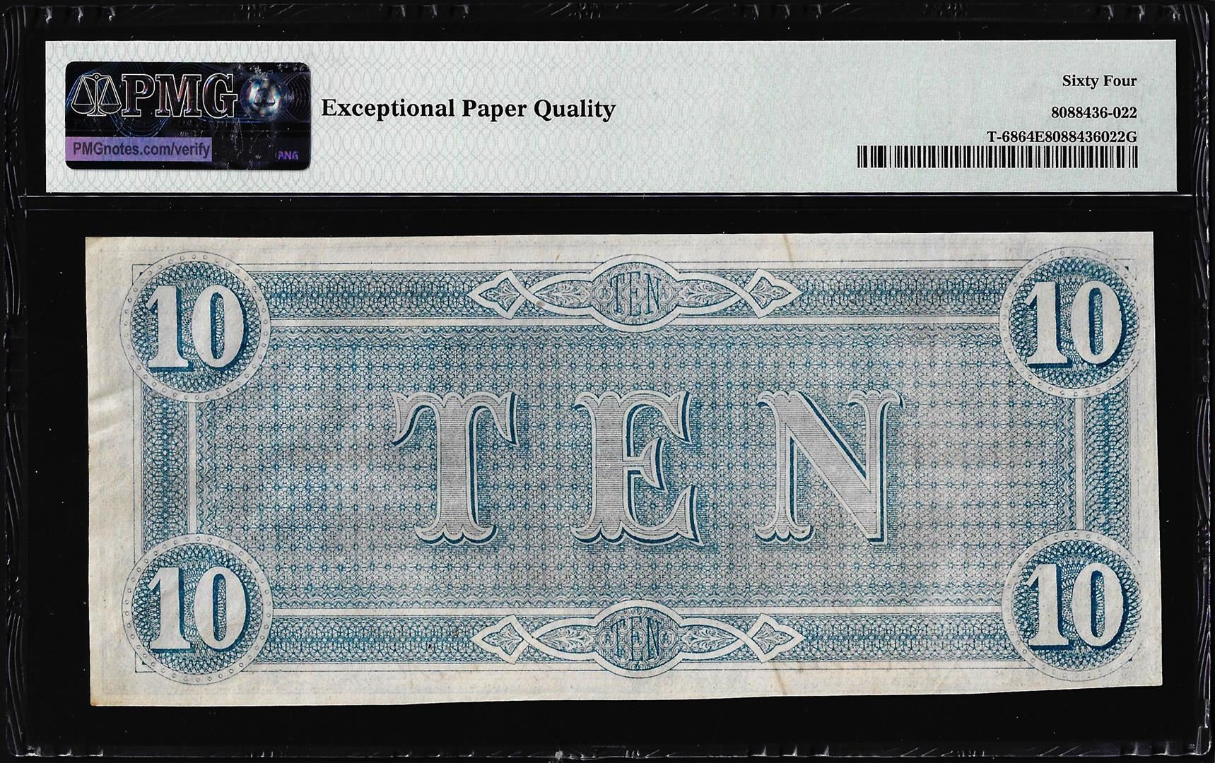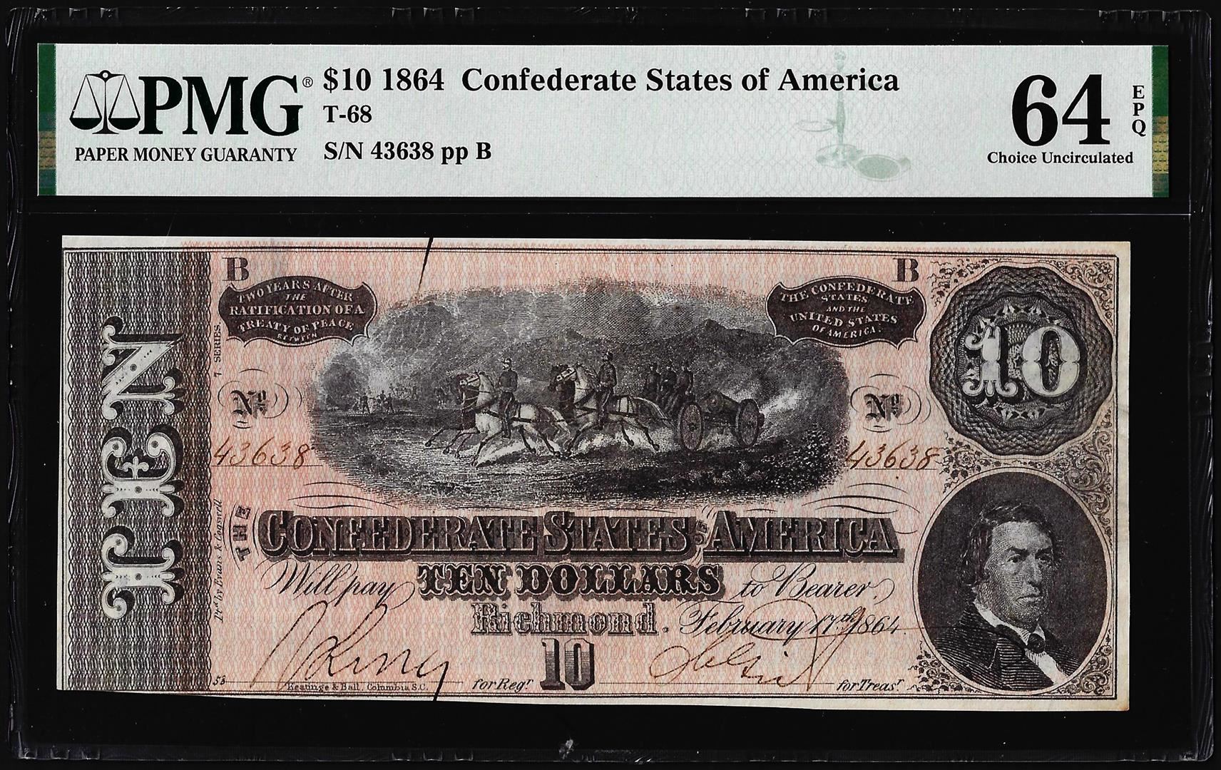 1864 $10 Confederate States of America Note T-68 PMG Choice Uncirculated 64EPQ