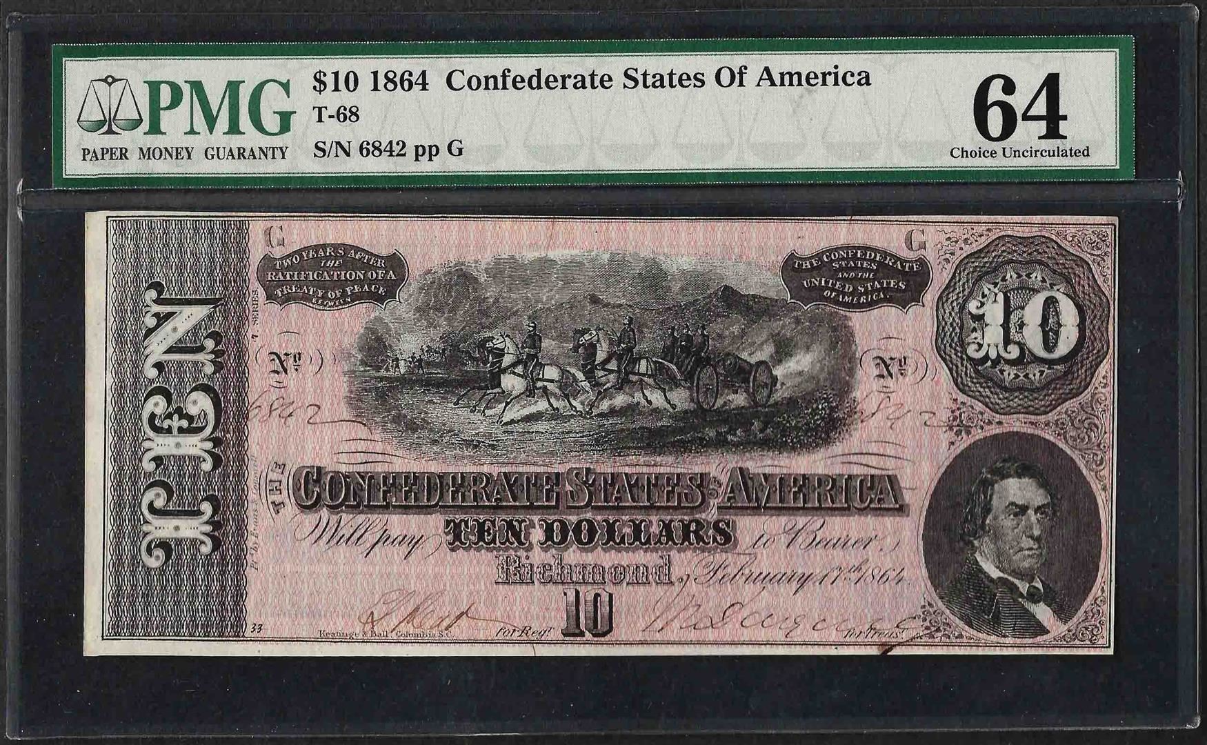 1864 $10 Confederate States of America Note T-68 PMG Choice Uncirculated 64