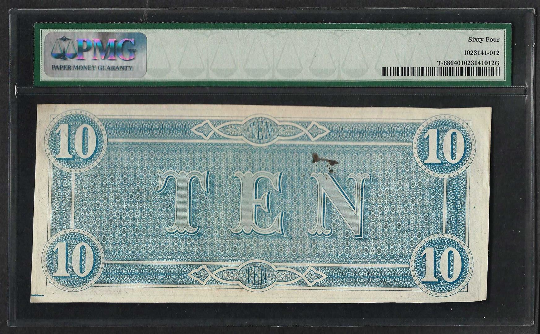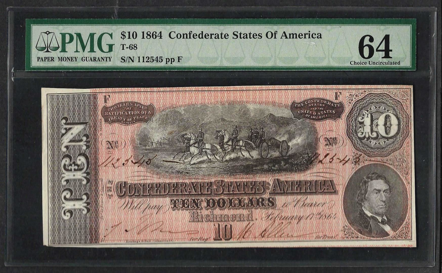 1864 $10 Confederate States of America Note T-68 PMG Choice Uncirculated 64