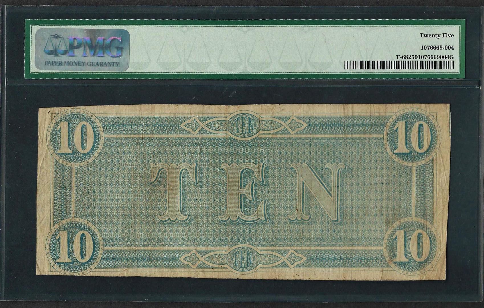 One 1864 $10 Confederate States of America Note T-68 PMG Very Fine 25. PMG Certified.