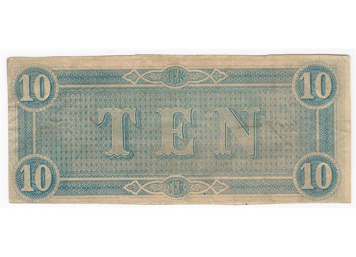 One 1864 $10 Confederate States of America Note.