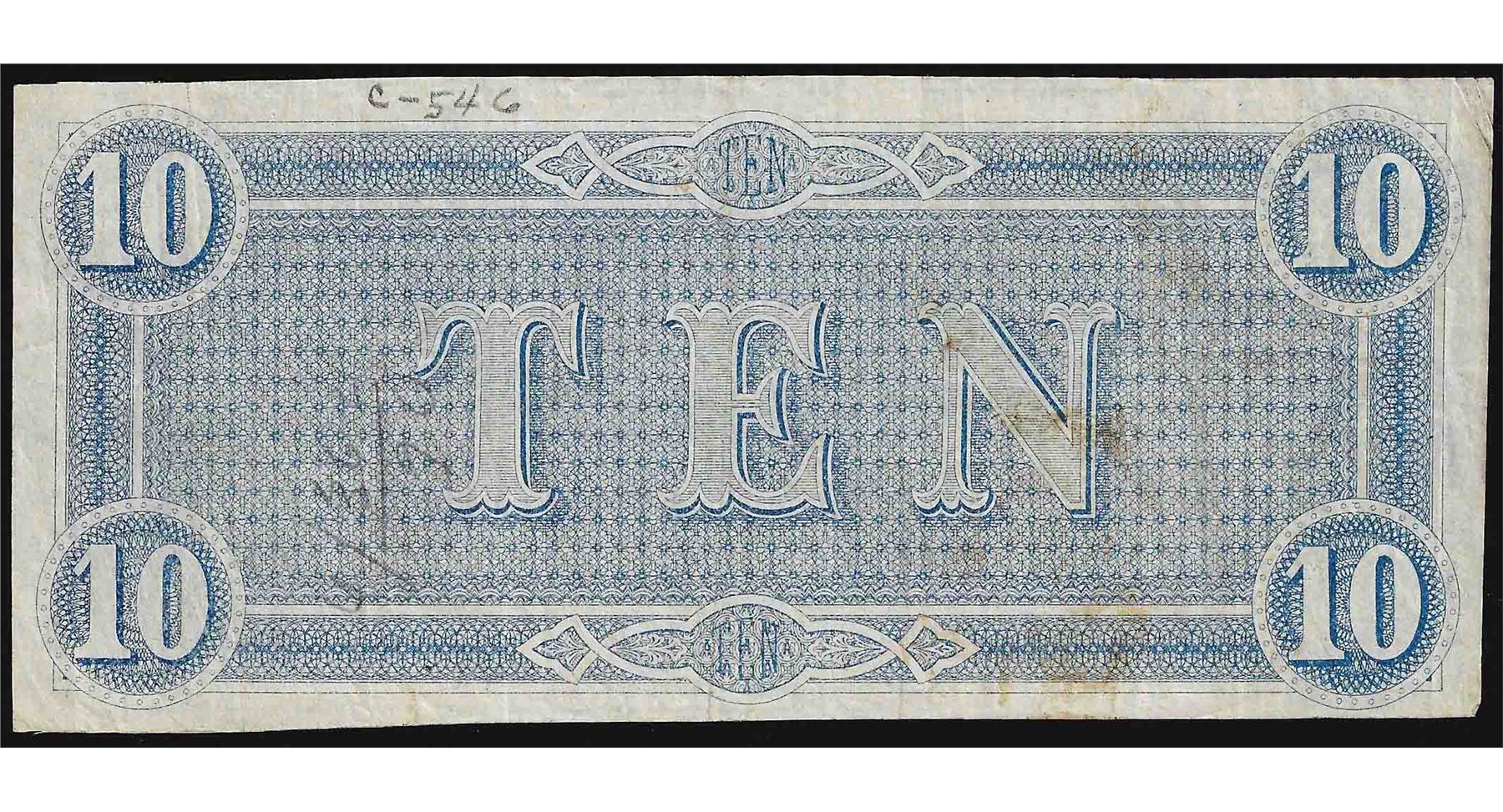 One 1864 $10 Confederate States of America Note.
