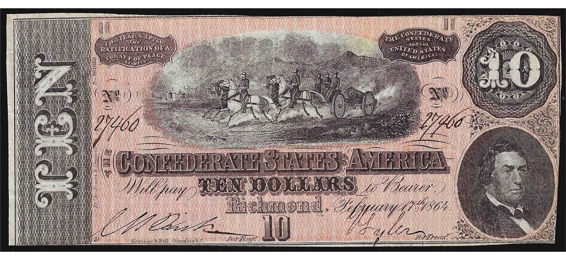 One 1864 $10 Confederate States of America Note.