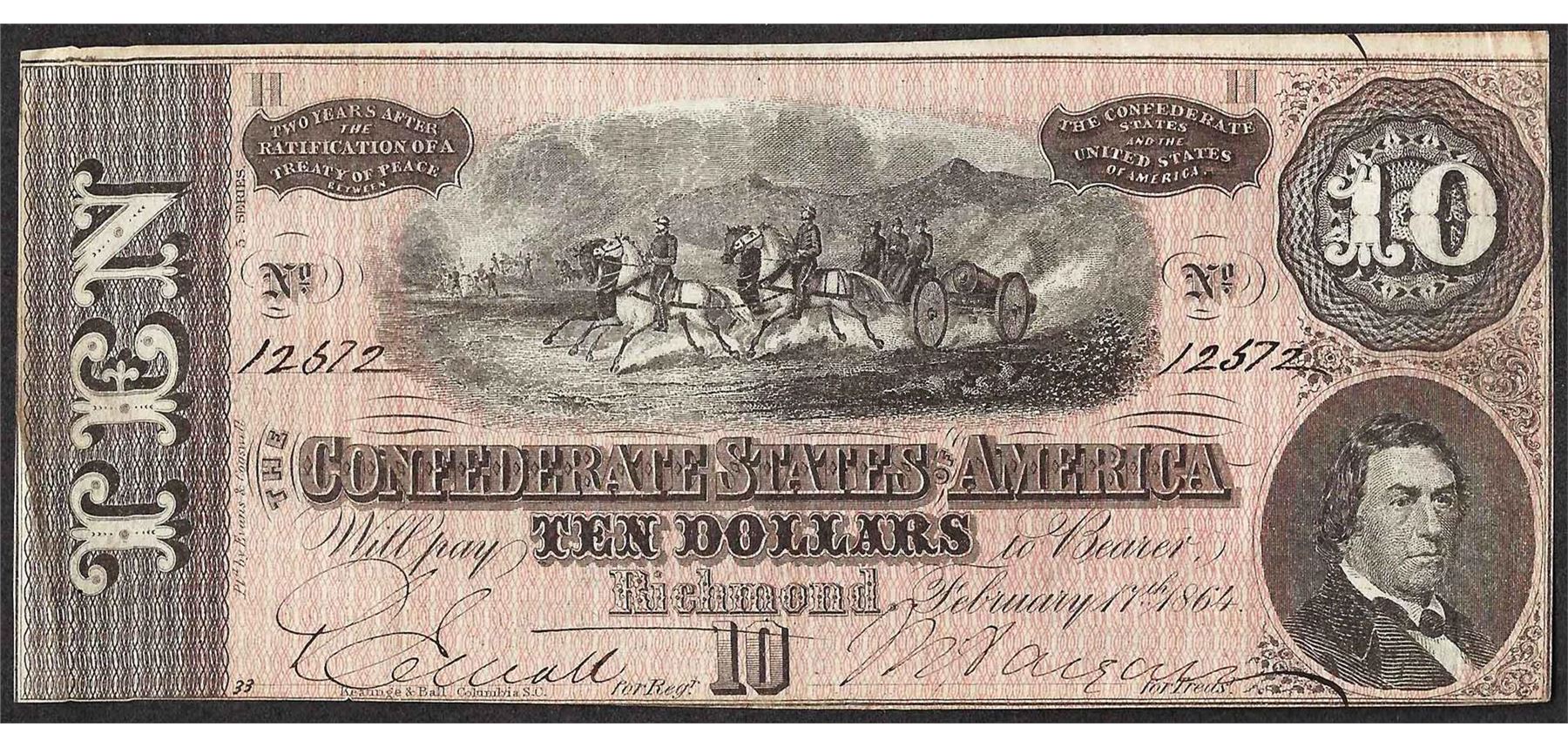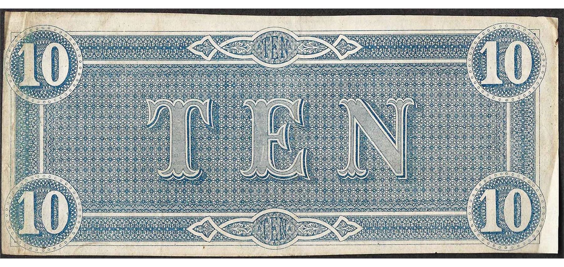 One 1864 $10 Confederate States of America Note.