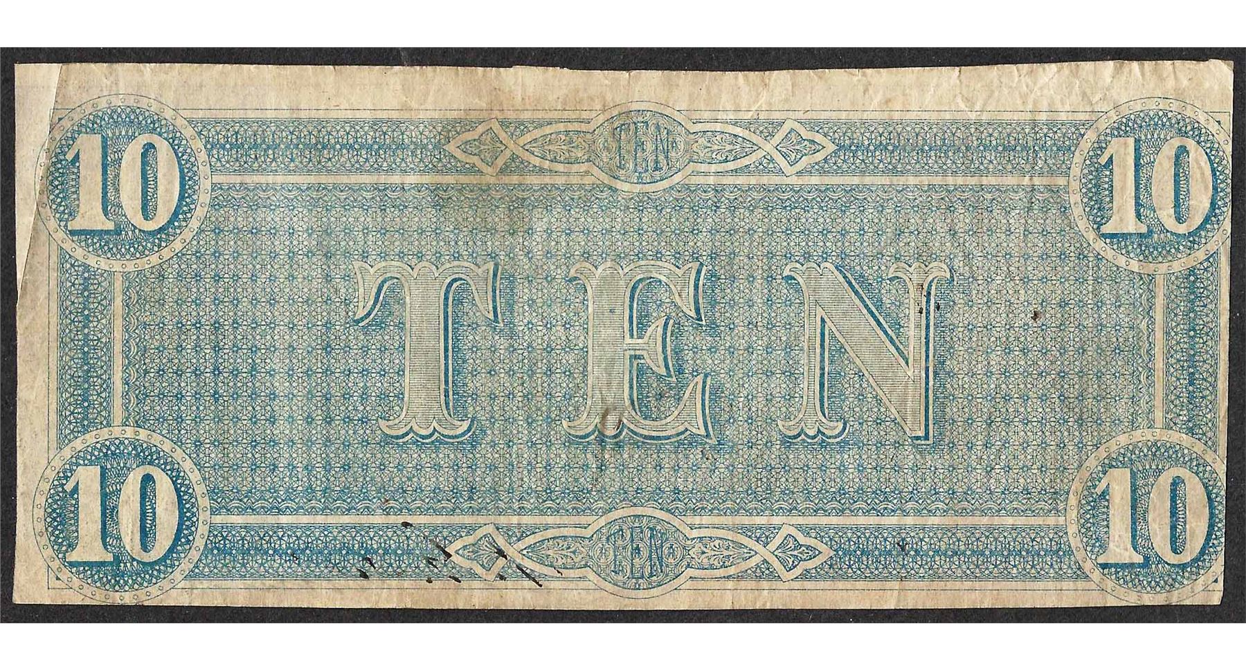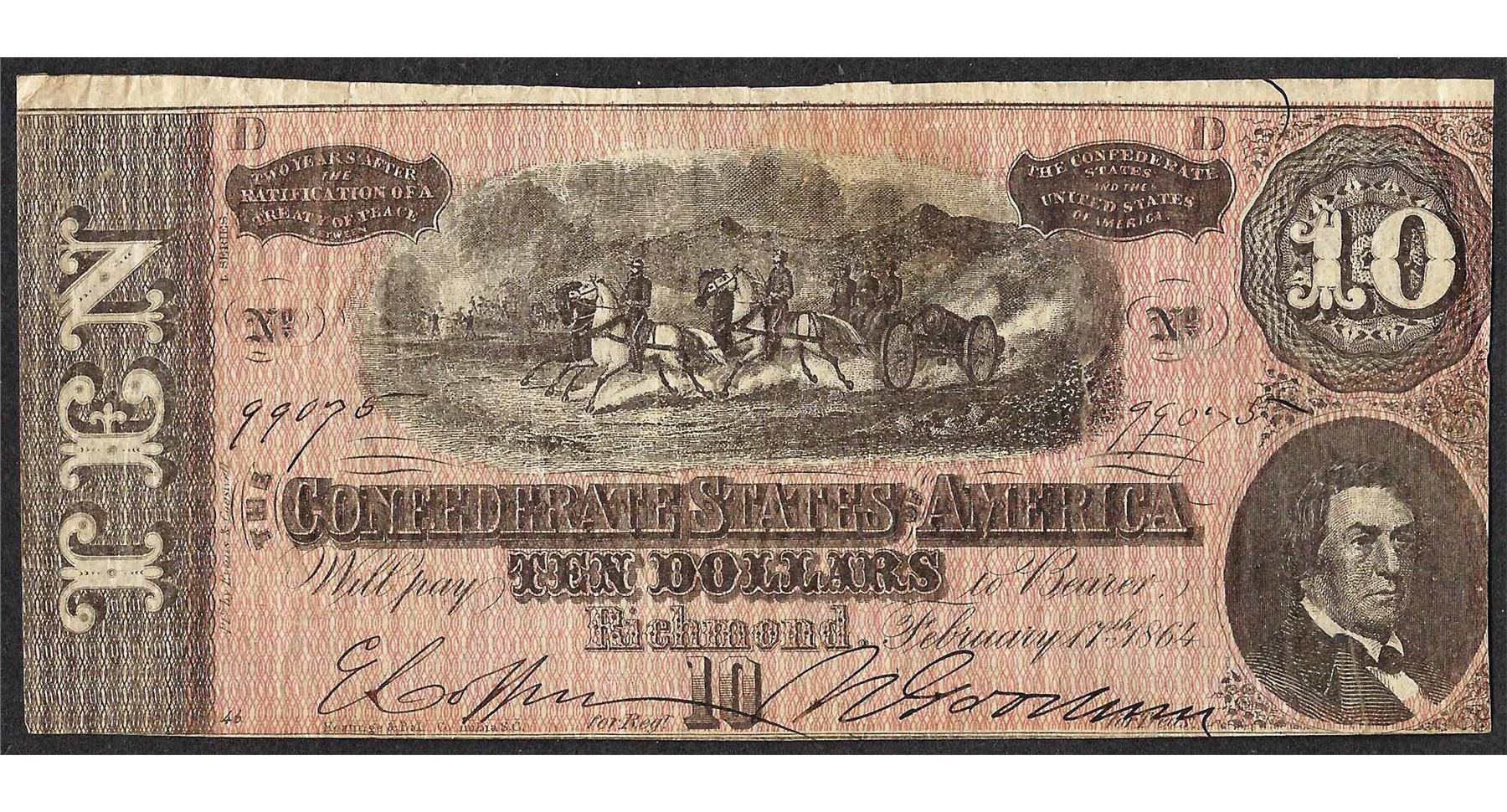 One 1864 $10 Confederate States of America Note.