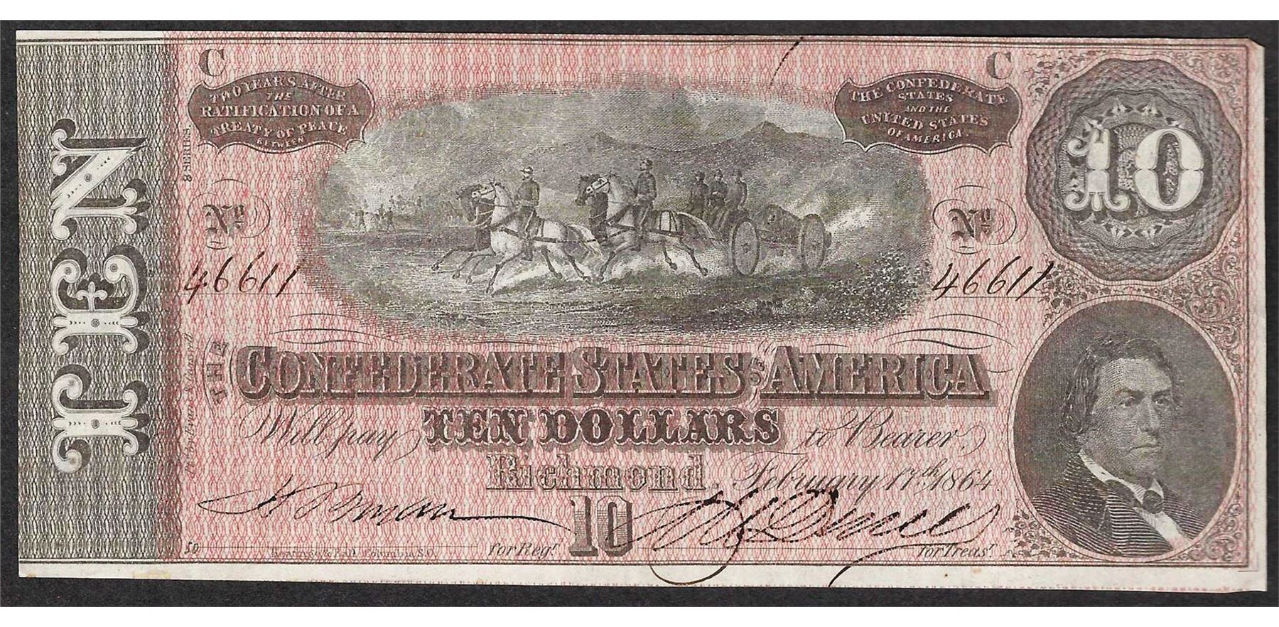 One 1864 $10 Confederate States of America Note.