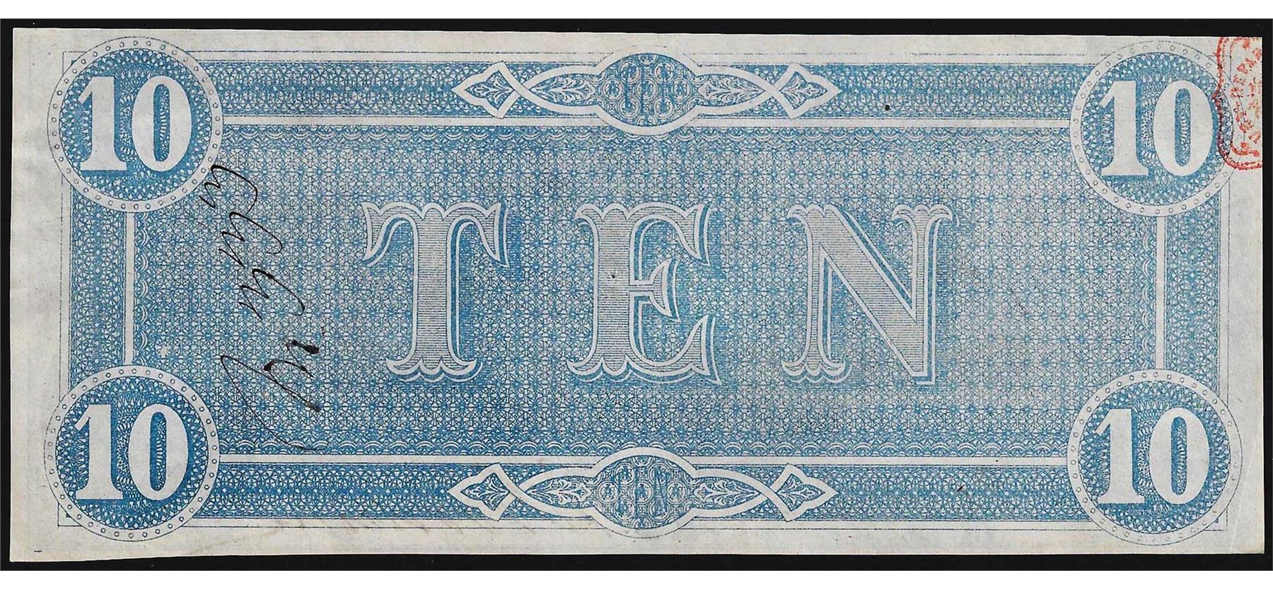 One 1864 $10 Confederate States of America Note.
