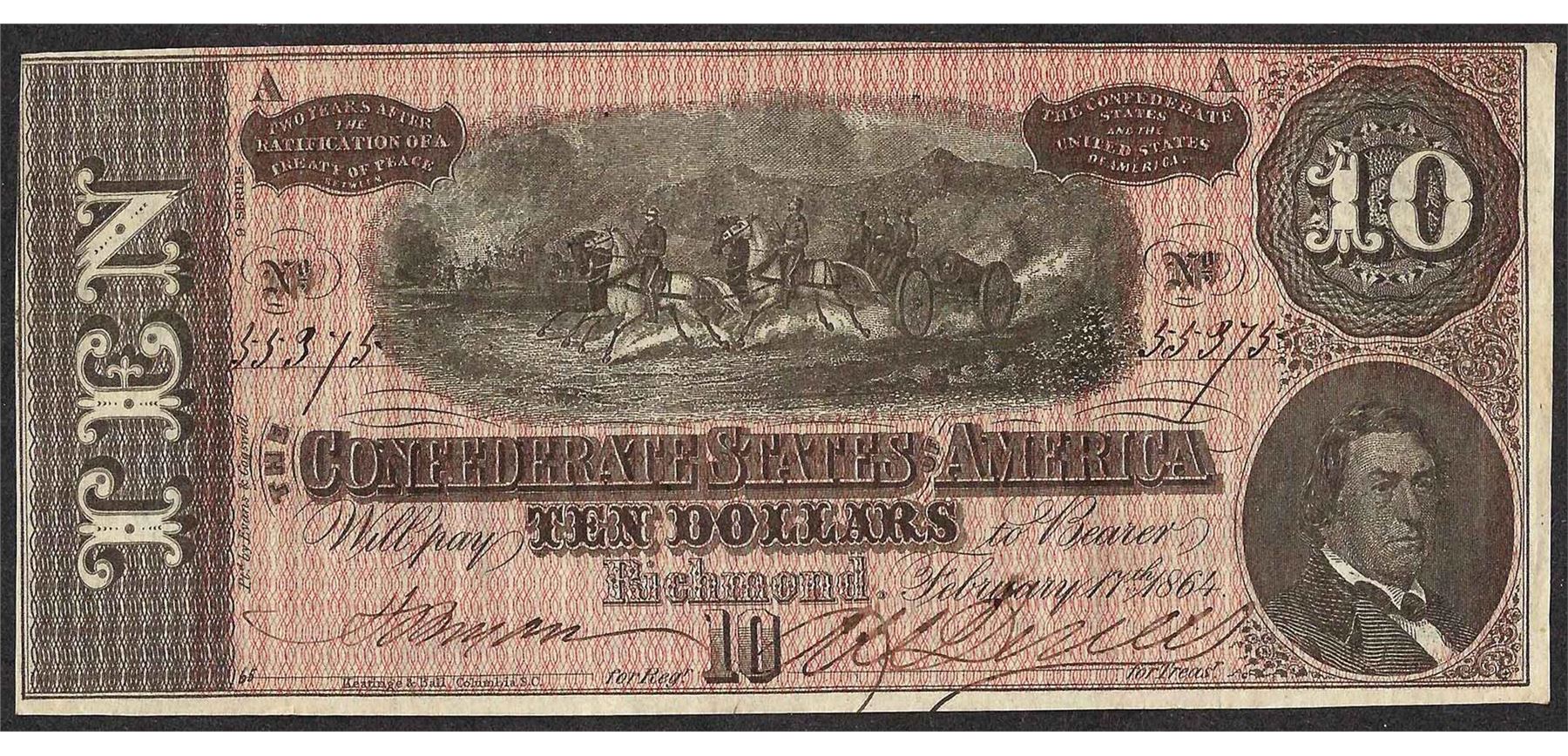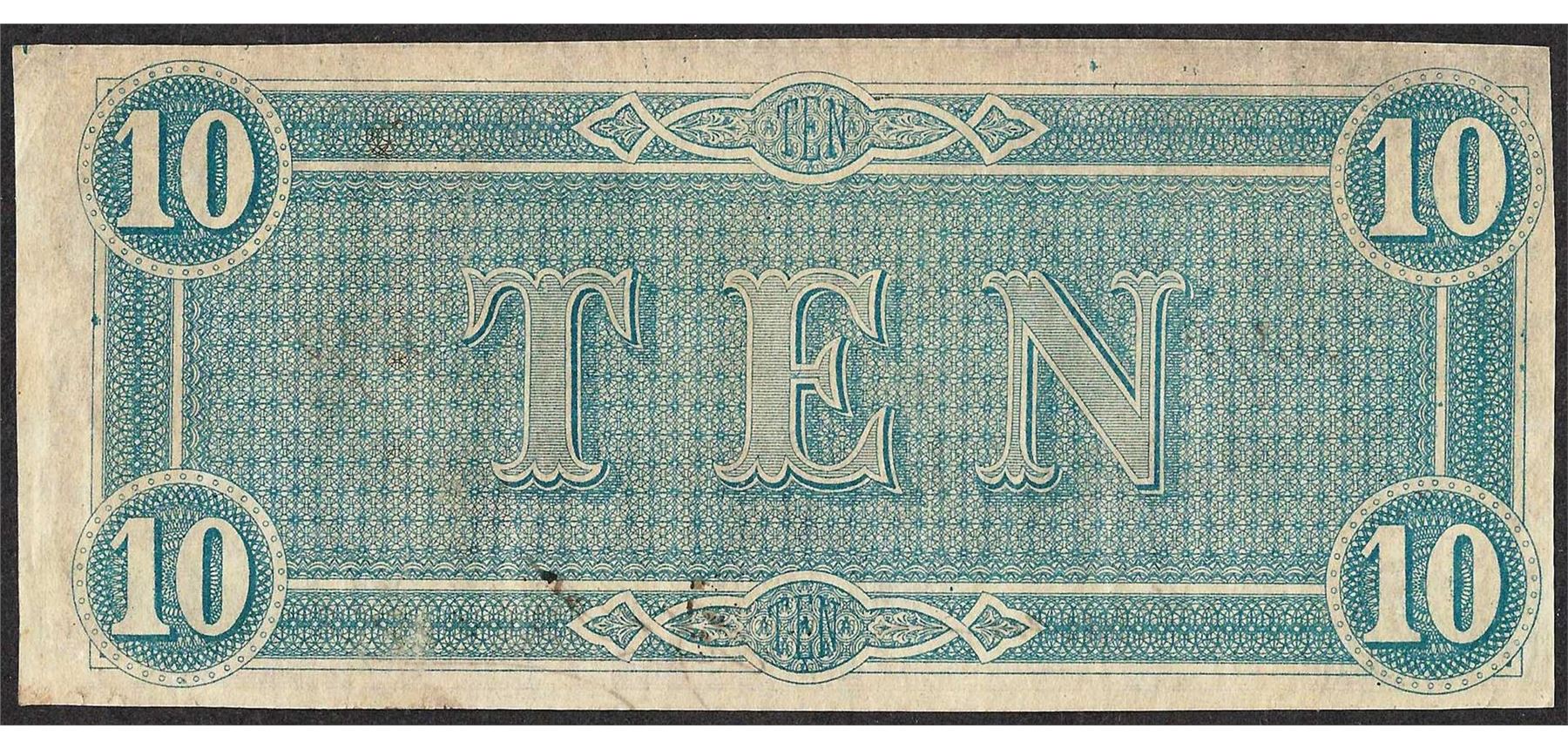 One 1864 $10 Confederate States of America Note.