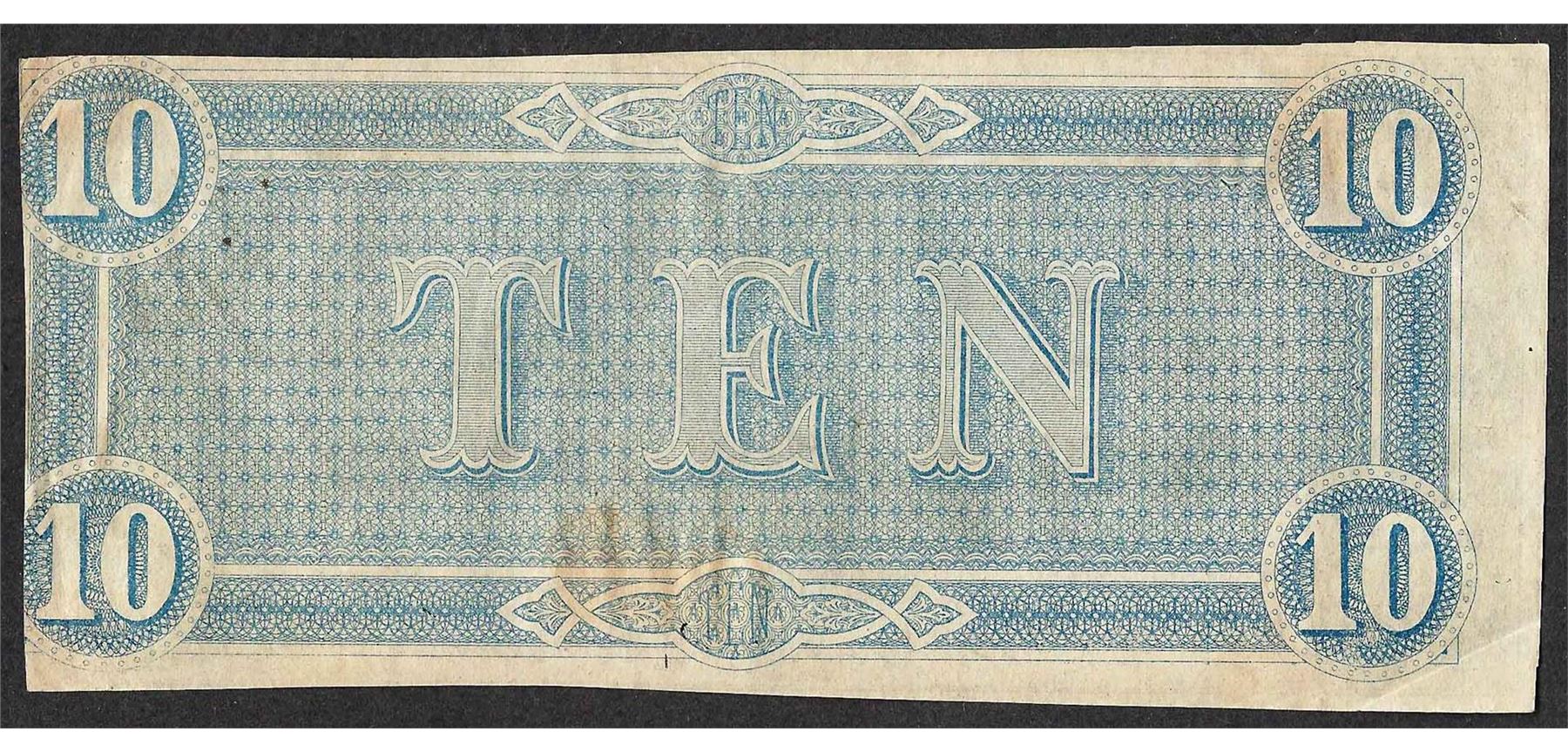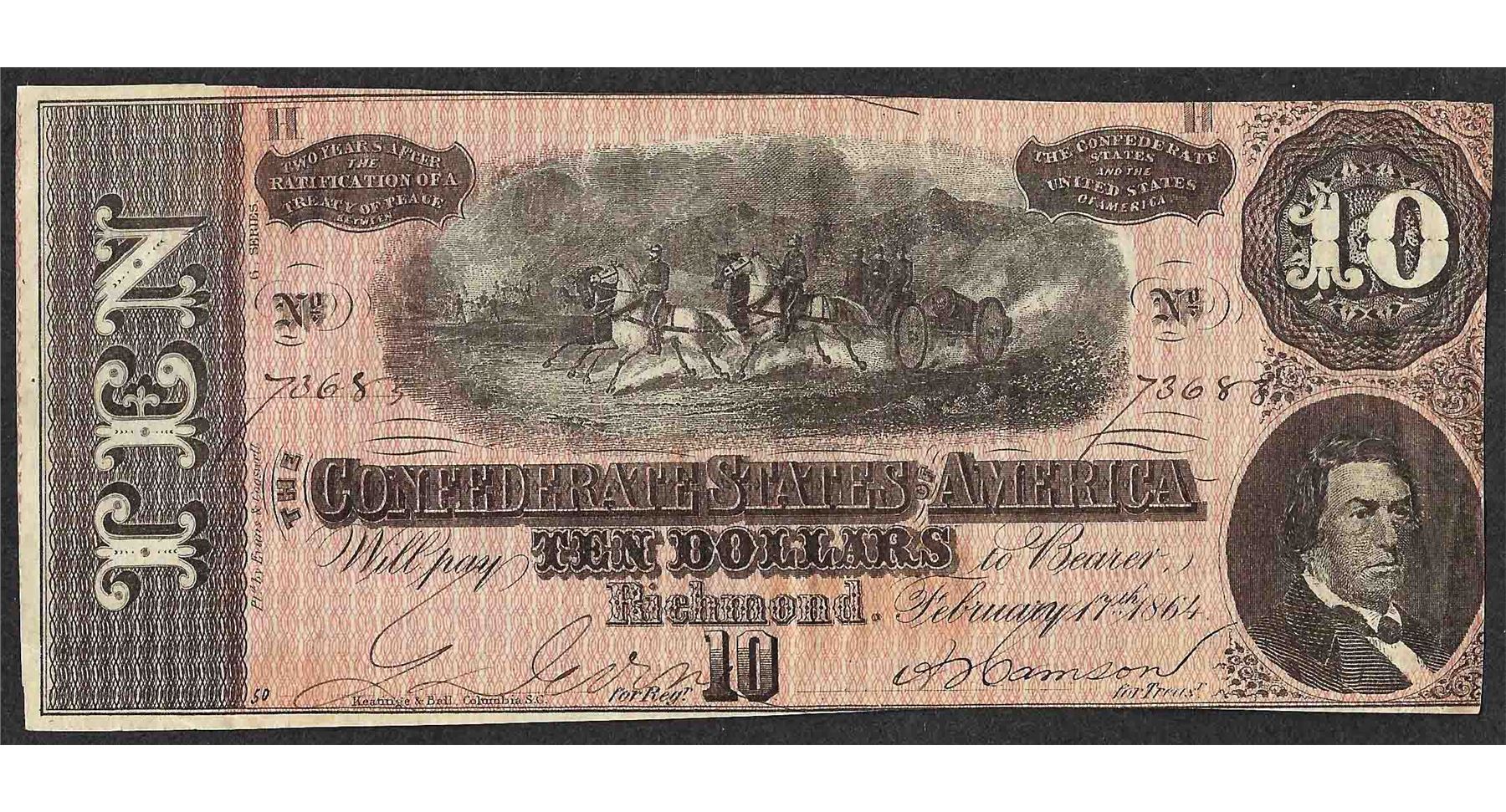 One 1864 $10 Confederate States of America Note.
