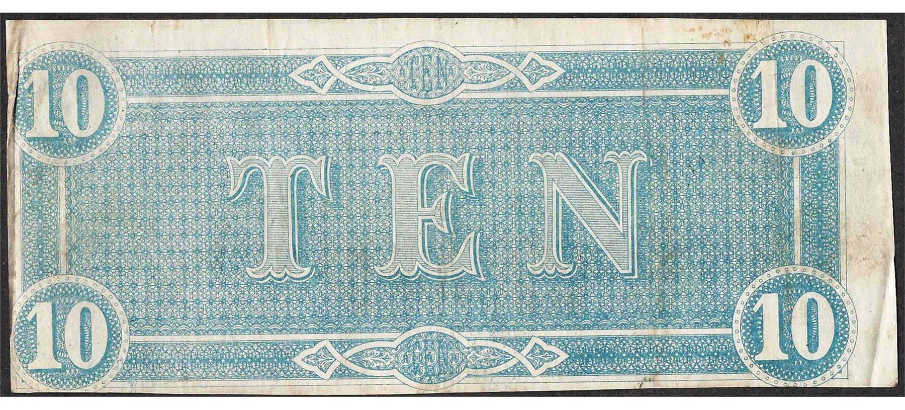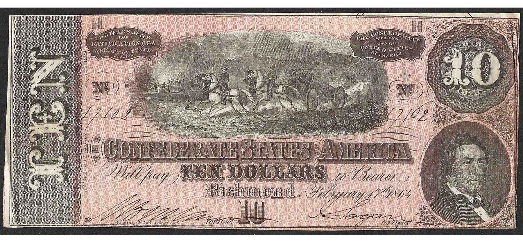 One 1864 $10 Confederate States of America Note.