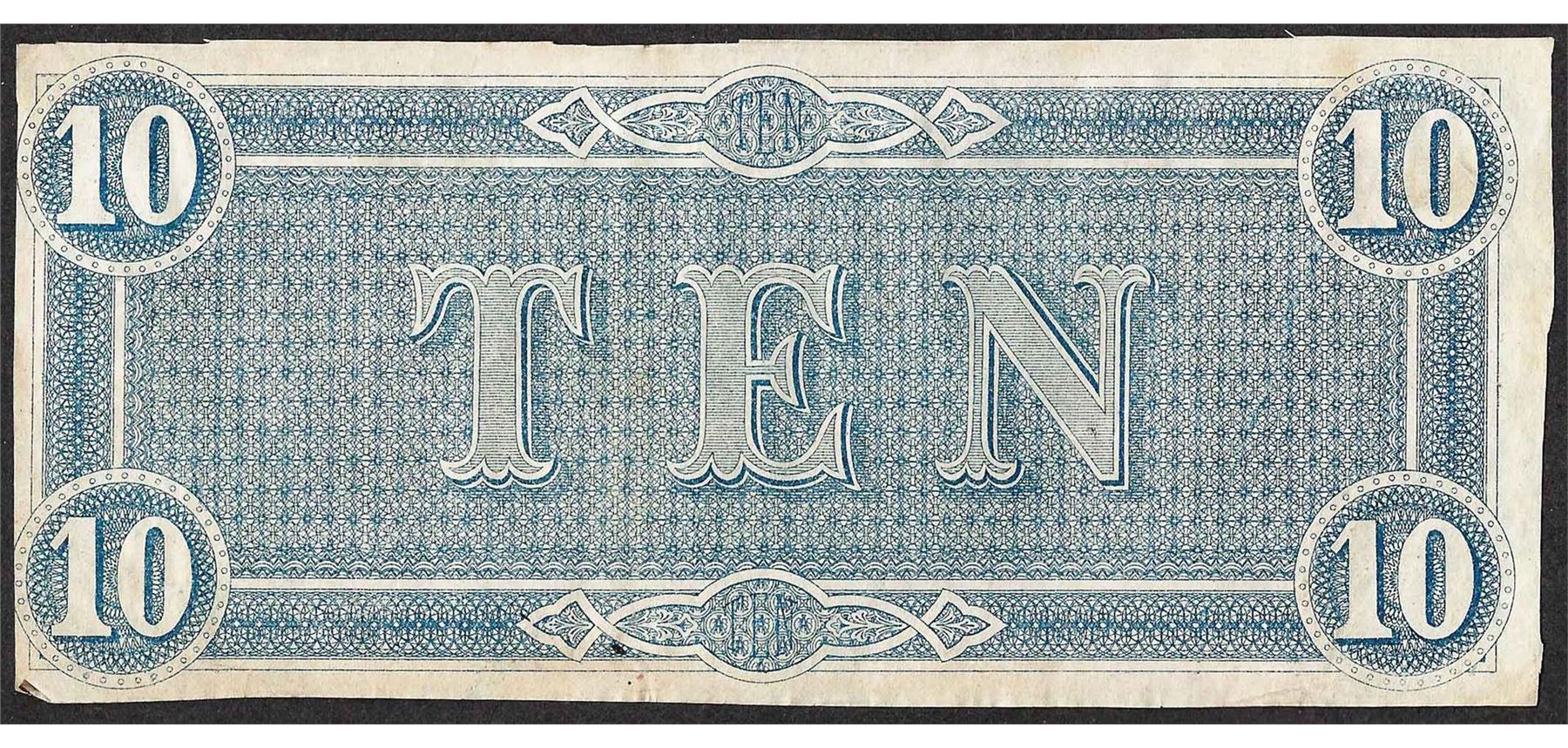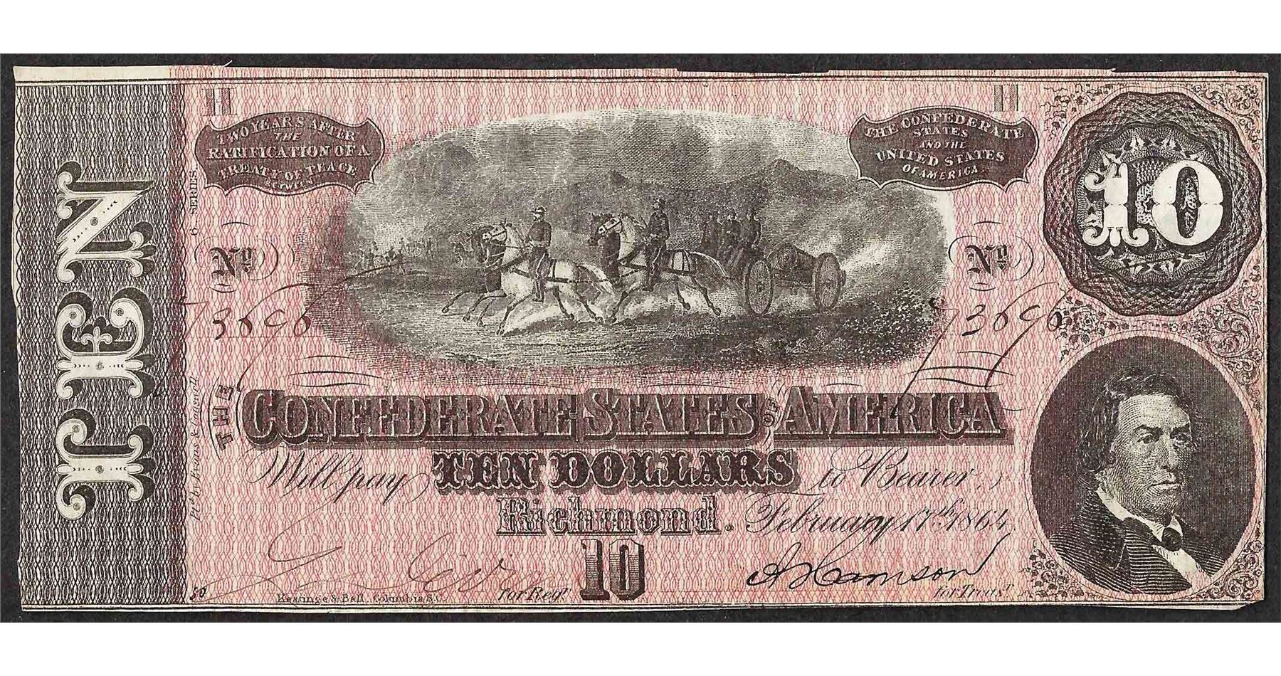 One 1864 $10 Confederate States of America Note.
