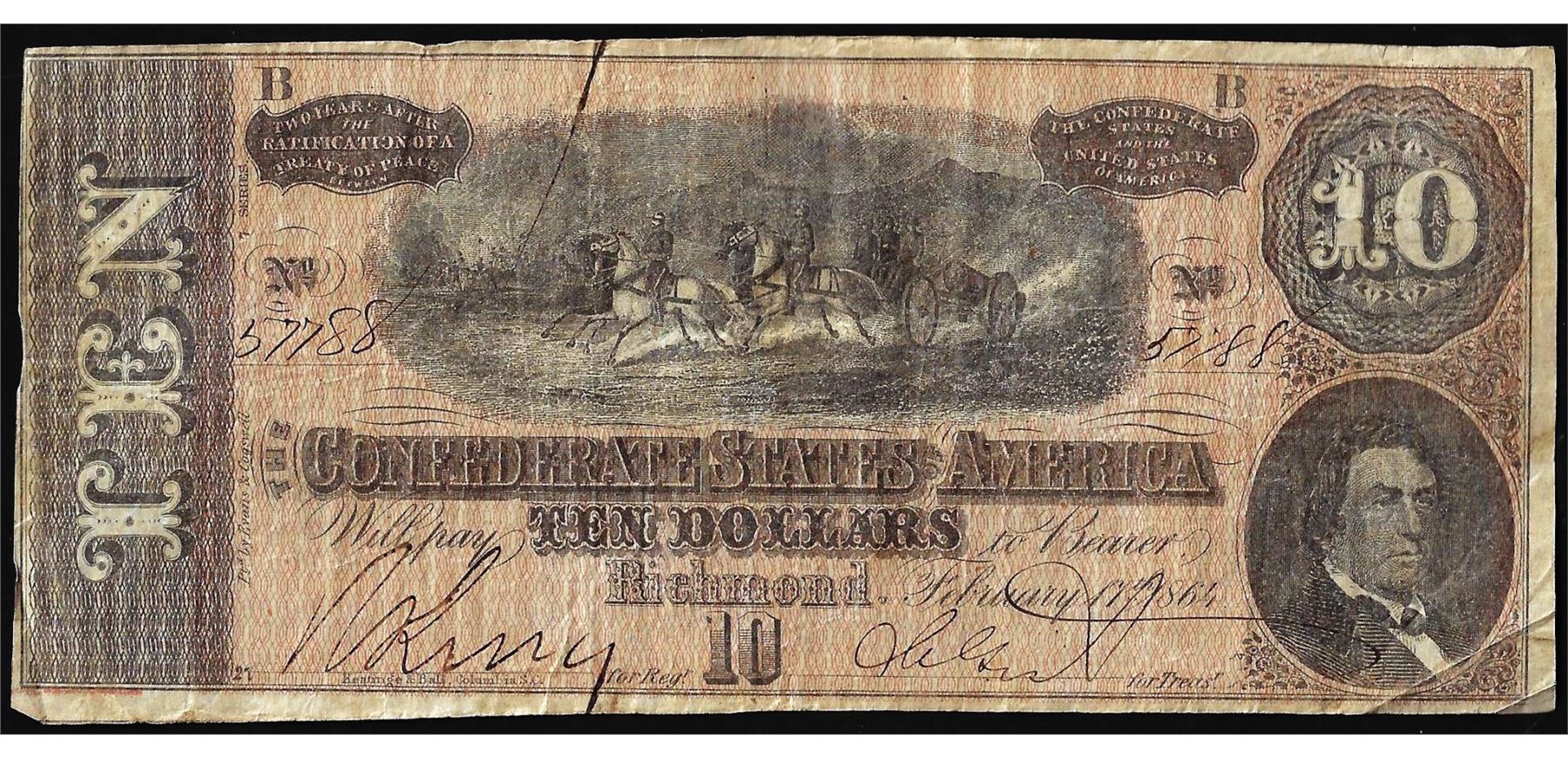 One 1864 $10 Confederate States of America Note.