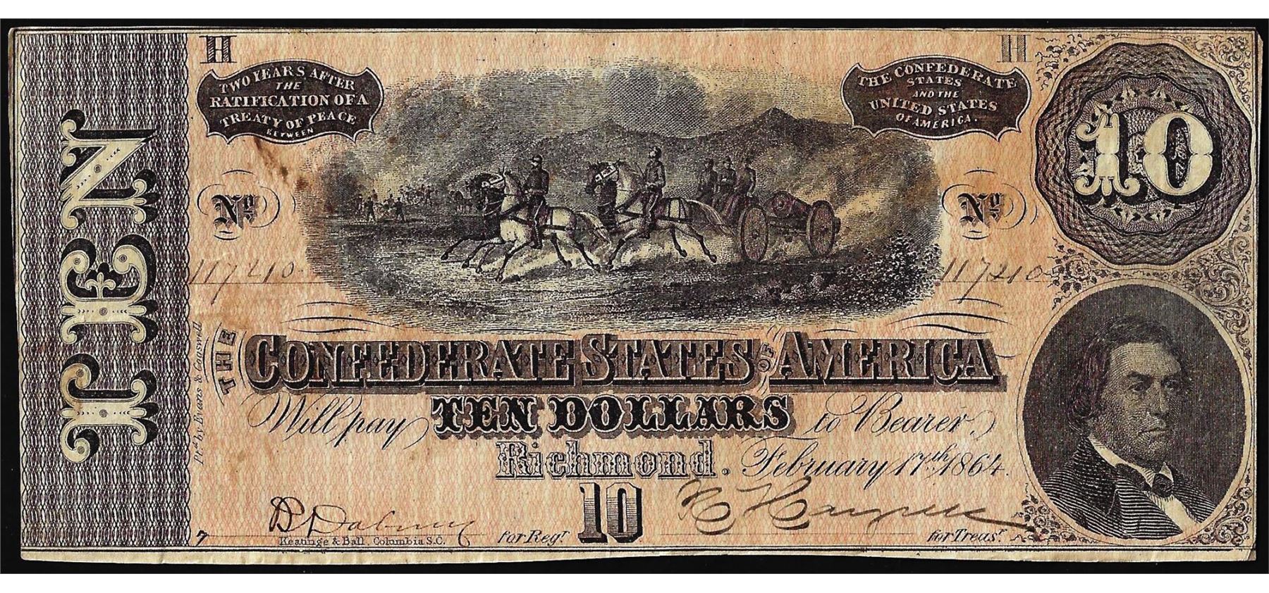 One 1864 $10 Confederate States of America Note.