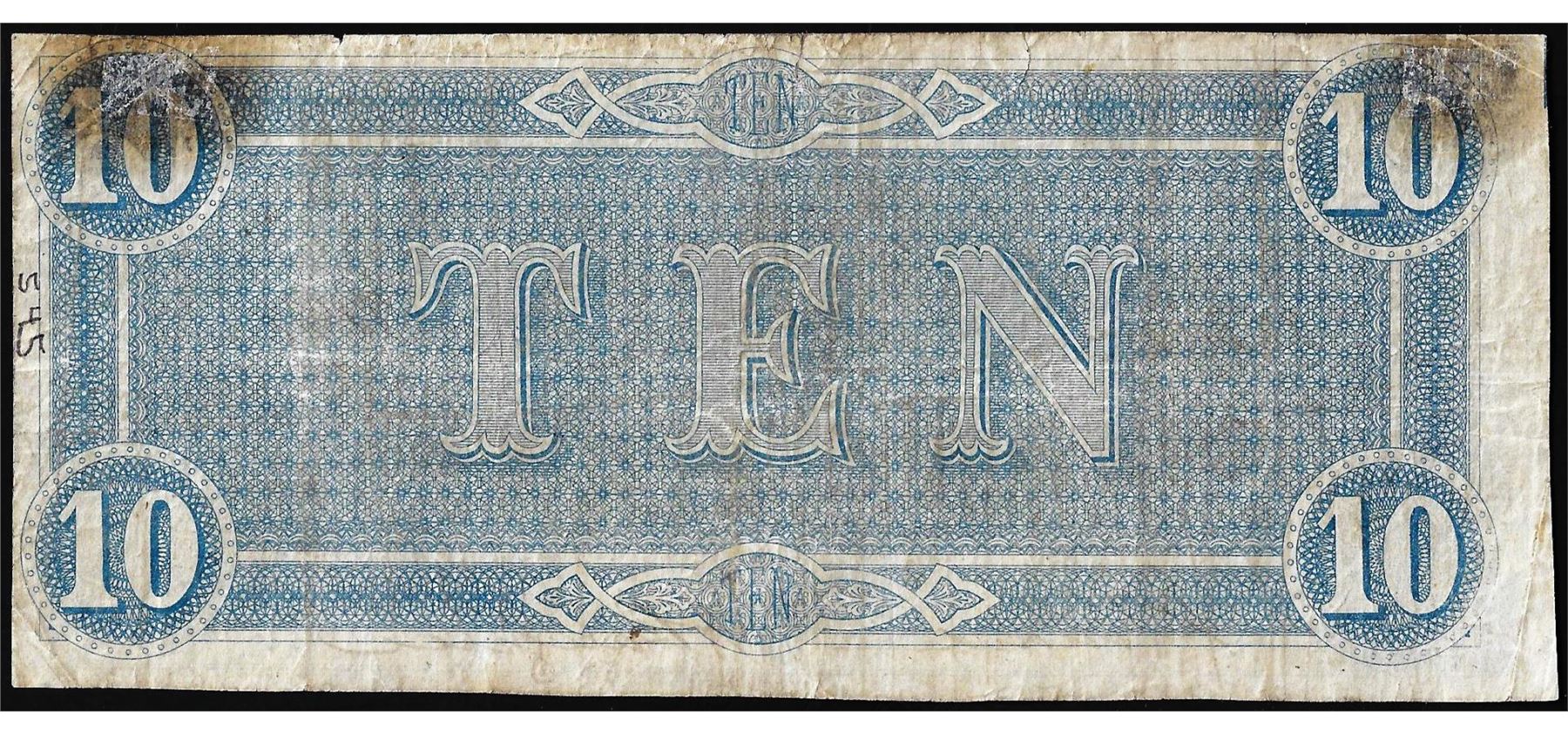 One 1864 $10 Confederate States of America Note.