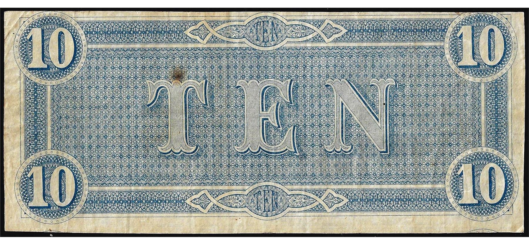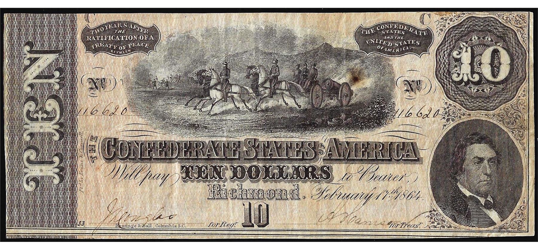 One 1864 $10 Confederate States of America Note.