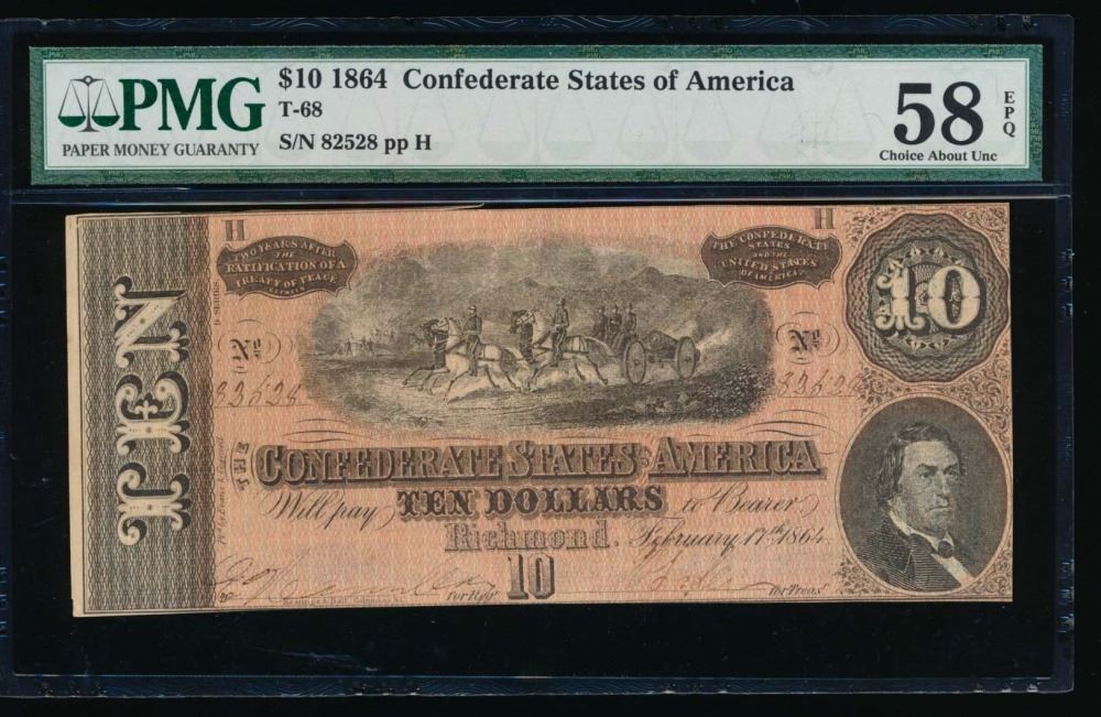 One 1864 $10 Confederate States of America Radar Note PMG 58EPQ.