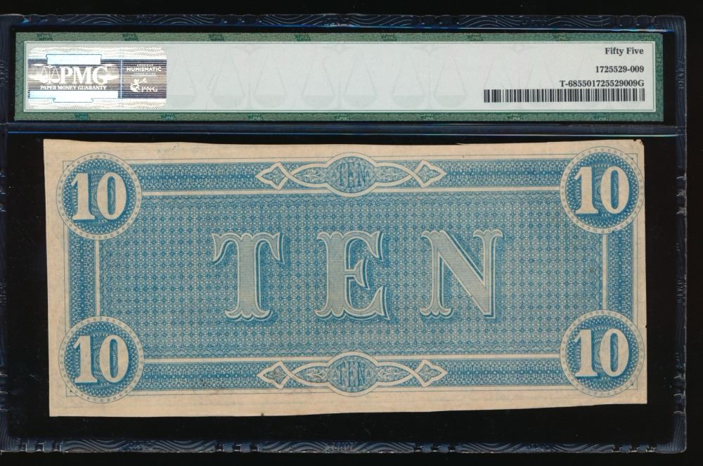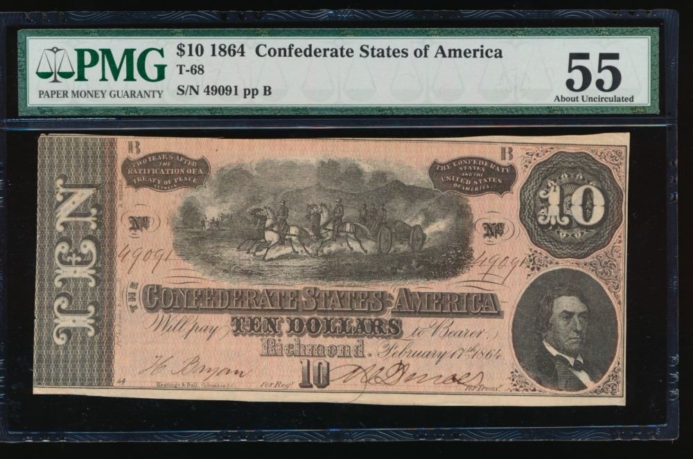 One 1864 $10 Confederate States of American Note PMG 55.