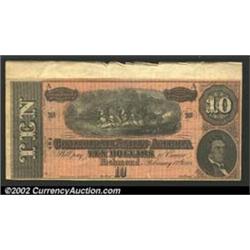 1864 $10 Horses pulling Cannon; R.M.T. Hunter on right, T-68, XF. A nice unsigned remainder with extra selvage at the top.