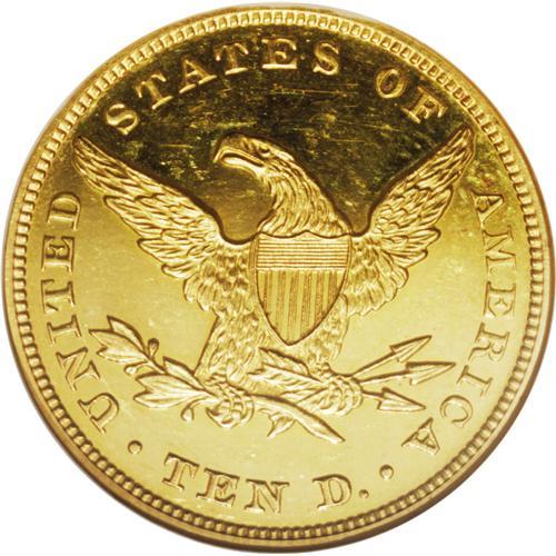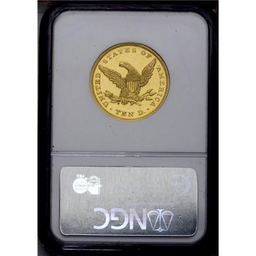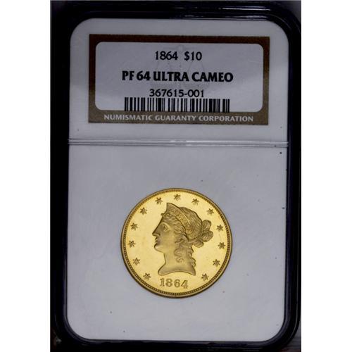 <B>1864<$10> PR64 Ultra Cameo NGC.</B></I> An impressive and extremely important example of proof gold coinage, and one of possibly a dozen to survive. Only 50 coins were minted in preparation for the release on February 11, but certainly far fewer were actually sold. Probably not more than 20 examples were actually sold at the time, and certainly some of those were later spent. Of approximately a dozen still surviving today, at least two are in museums (the Smithsonian and ANS coins), and others are impaired. Without a doubt, this is one of only a handful of attractive, unimpaired proofs in existence.<BR> Some pedigree confusion exists for this issue. In the unpublished manuscript for the Trompeter large denomination proof gold collection, that coin was traced back to the Gaston DiBello collection, lot 1075, reappearing in Stack's sale of 4/1978 and their session of Auction '79. The DiBello coin was also identified as the coin that Harry Bass purchased, reappearing in the 10/1999 sale of the Bass Collection. The DiBello and Bass plates certainly appear to match. Of course, the present Lake Highlands Collection coin is neither of the above, although its pedigree has not been specifically determined.<BR> Both sides of this attractive proof example display exceptional contrast with highly lustrous and deep yellow-gold devices, surrounded by fully mirrored fields. A hint of green color is observed. A few wispy hairlines are visible in the fields, and a couple of breaks are noted in the luster of the central obverse motif. Regardless, this is a lovely example that will certainly please the connoisseur.<BR><I>From The Lake Highlands Collection.</B></I> <BR><BR><B>Important notice:<