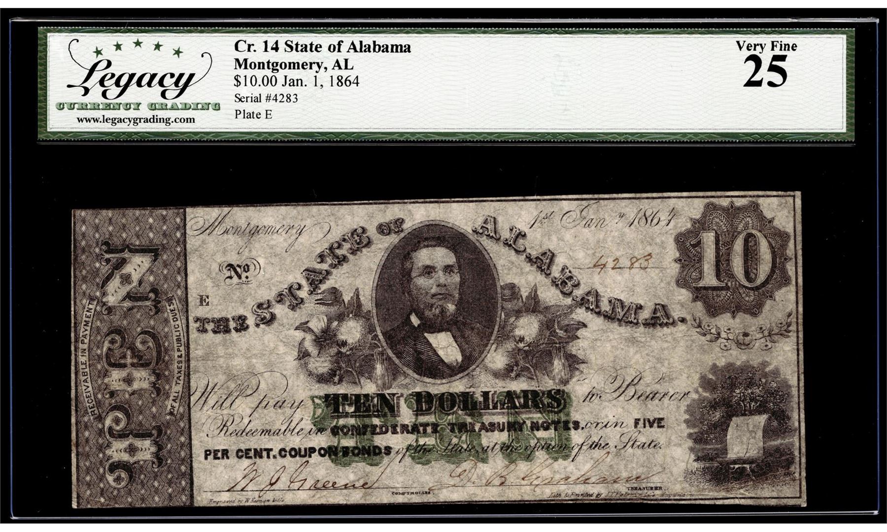 One 1864 $10 State of Alabama Montgomery, AL Obsolete Note Cr.14 Legacy Very Fine 25. Legacy Graded.