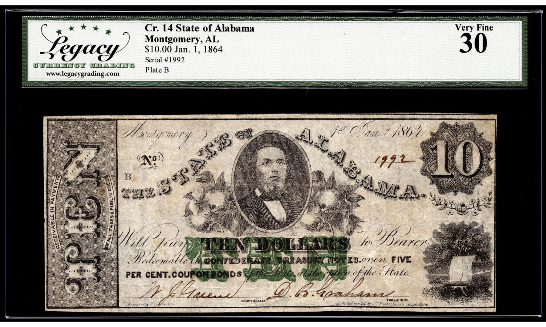 One 1864 $10 State of Alabama Montgomery, AL Obsolete Note Cr.14 Legacy Very Fine 30. Legacy Graded.