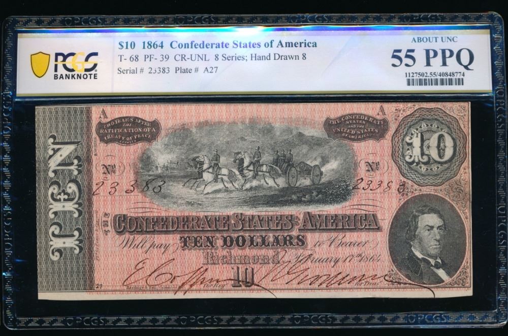 One 1864 $10 T-68 Confederate PCGS 55PPQ.