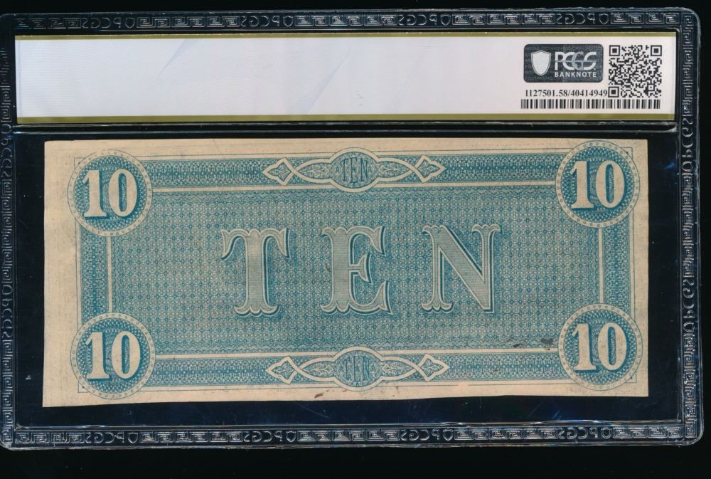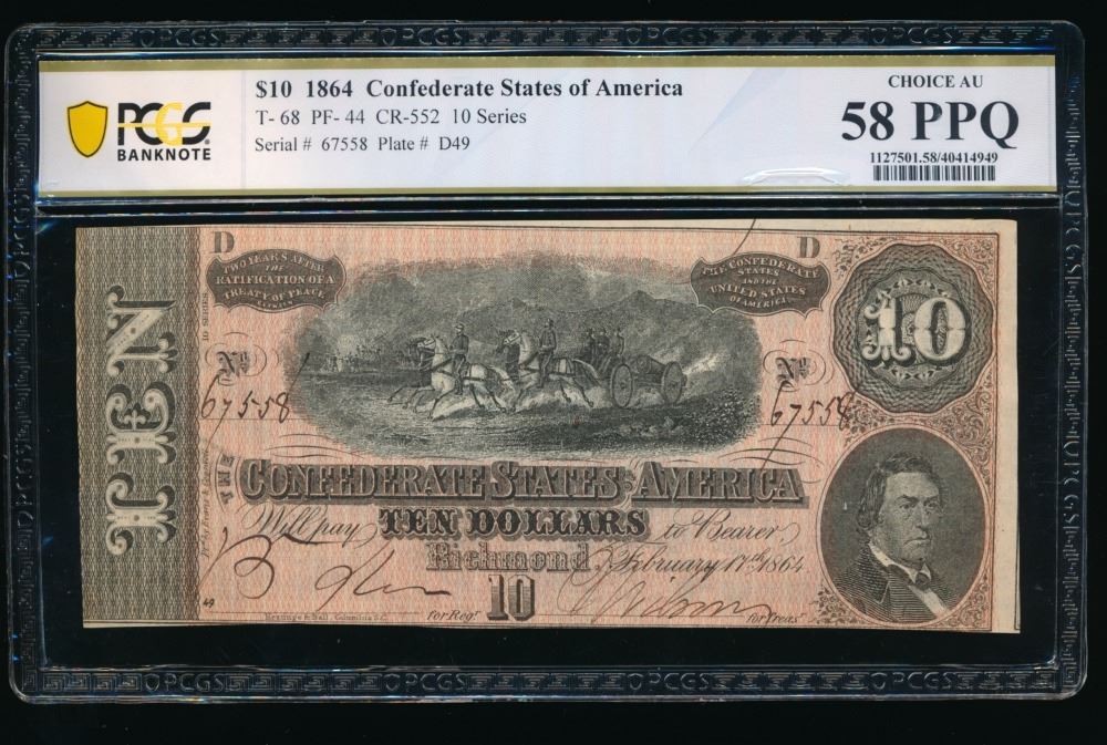 One 1864 $10 T-68 Confederate PCGS 58PPQ.