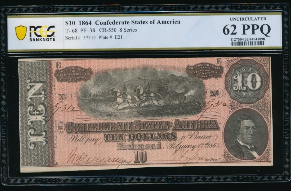 One 1864 $10 T-68 Confederate PCGS 62PPQ.
