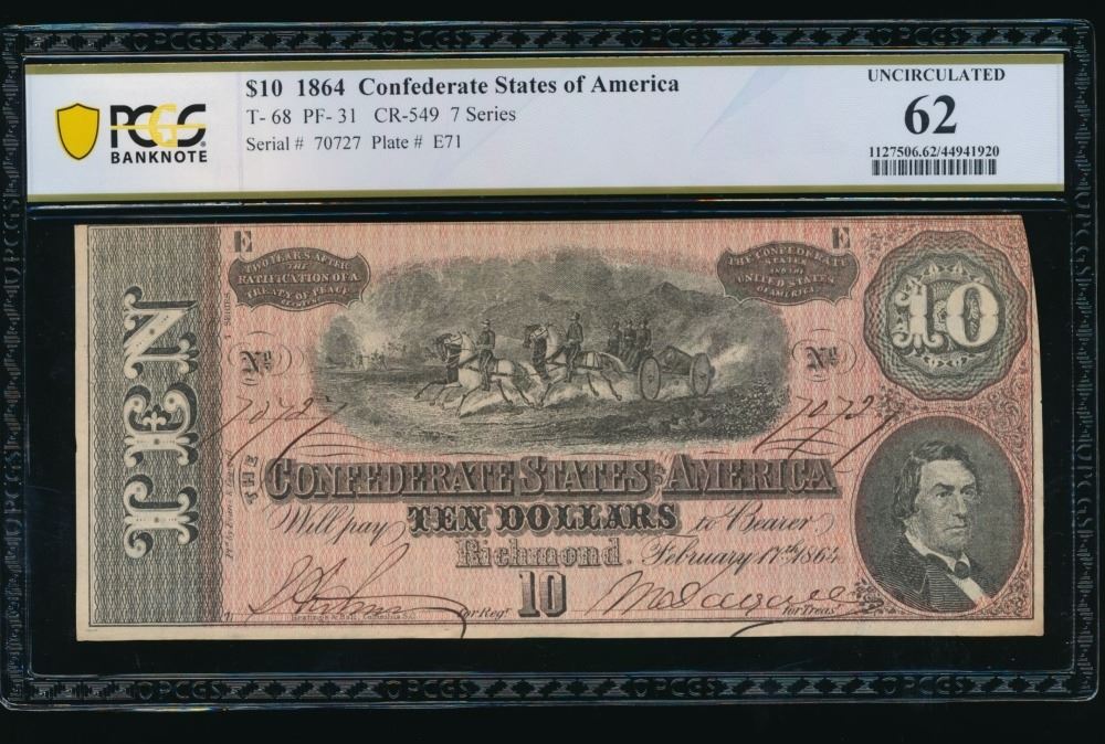 One 1864 $10 T-68 Confederate PCGS 62.