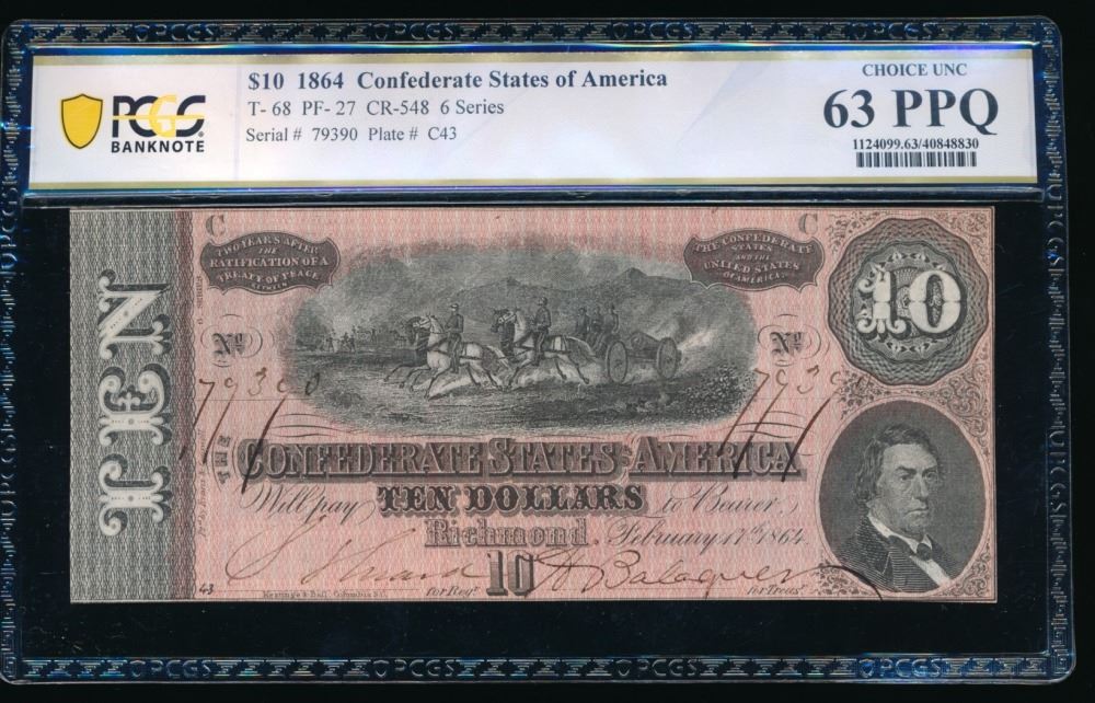 One 1864 $10 T-68 Confederate PCGS 63PPQ.