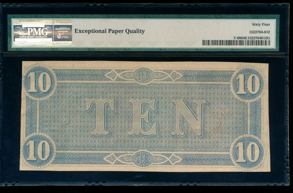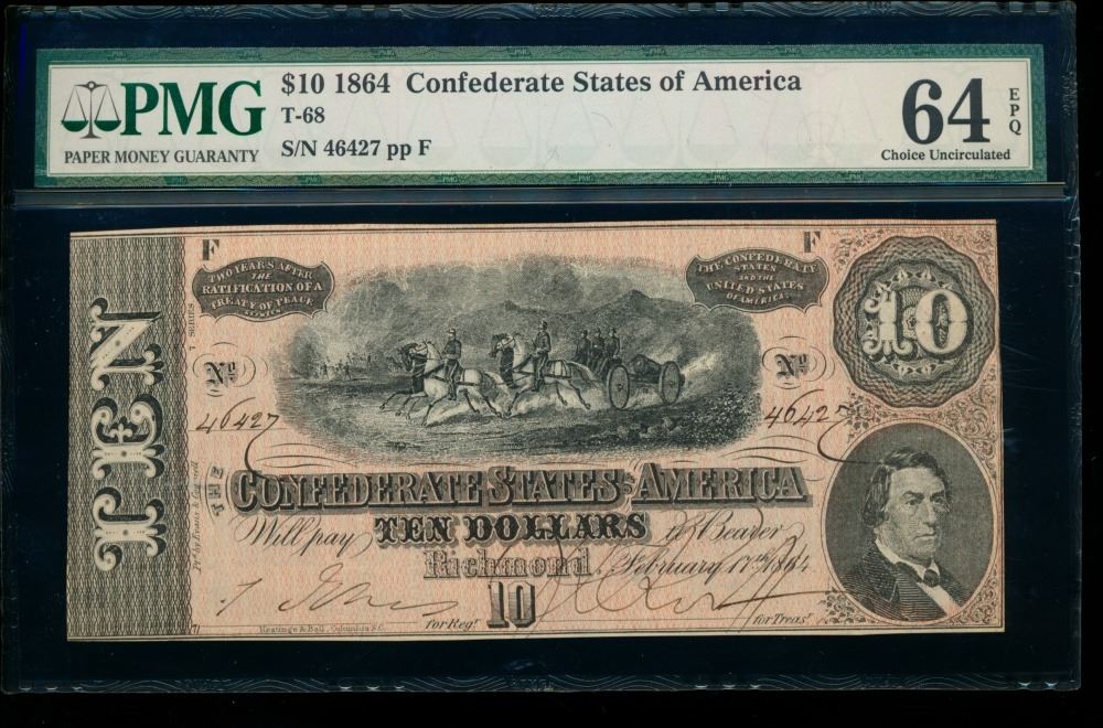 One 1864 $10 T-68 Confederate PCGS 64EPQ.
