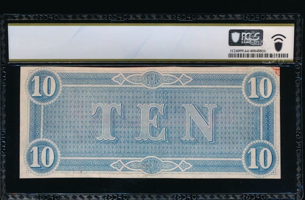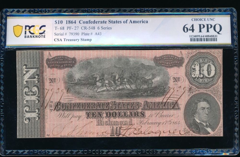 One 1864 $10 T-68 Confederate PCGS 64PPQ.