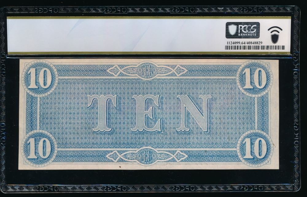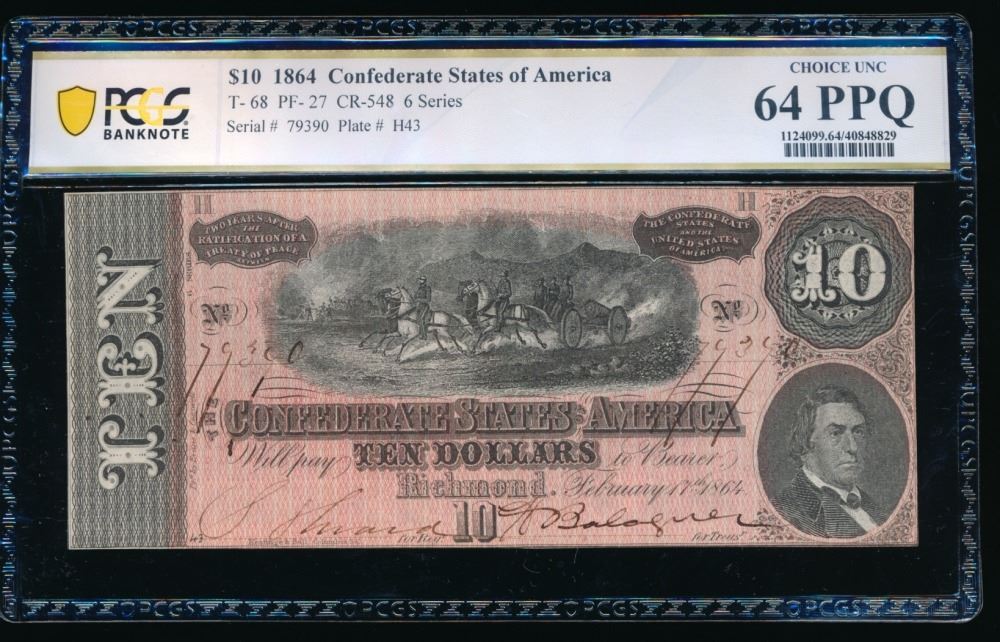 One 1864 $10 T-68 Confederate PCGS 64PPQ.