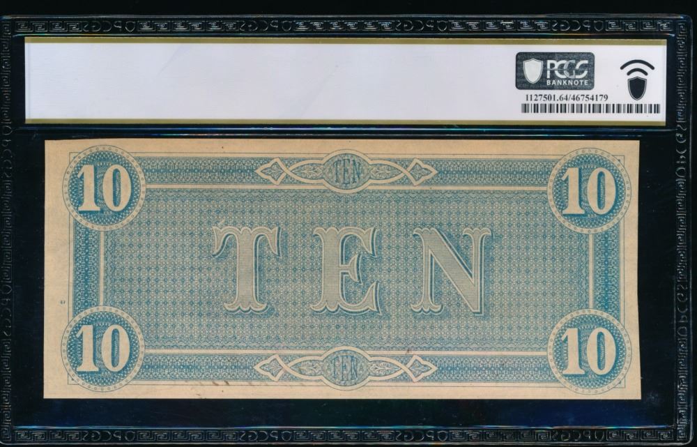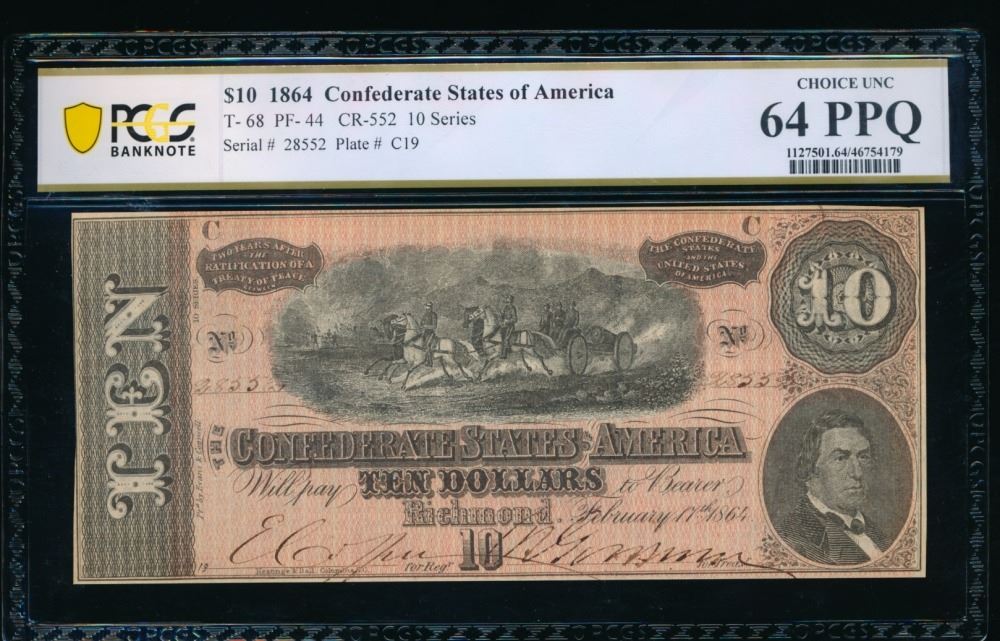 One 1864 $10 T-68 Confederate PCGS 64PPQ.