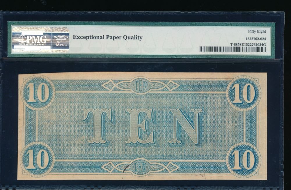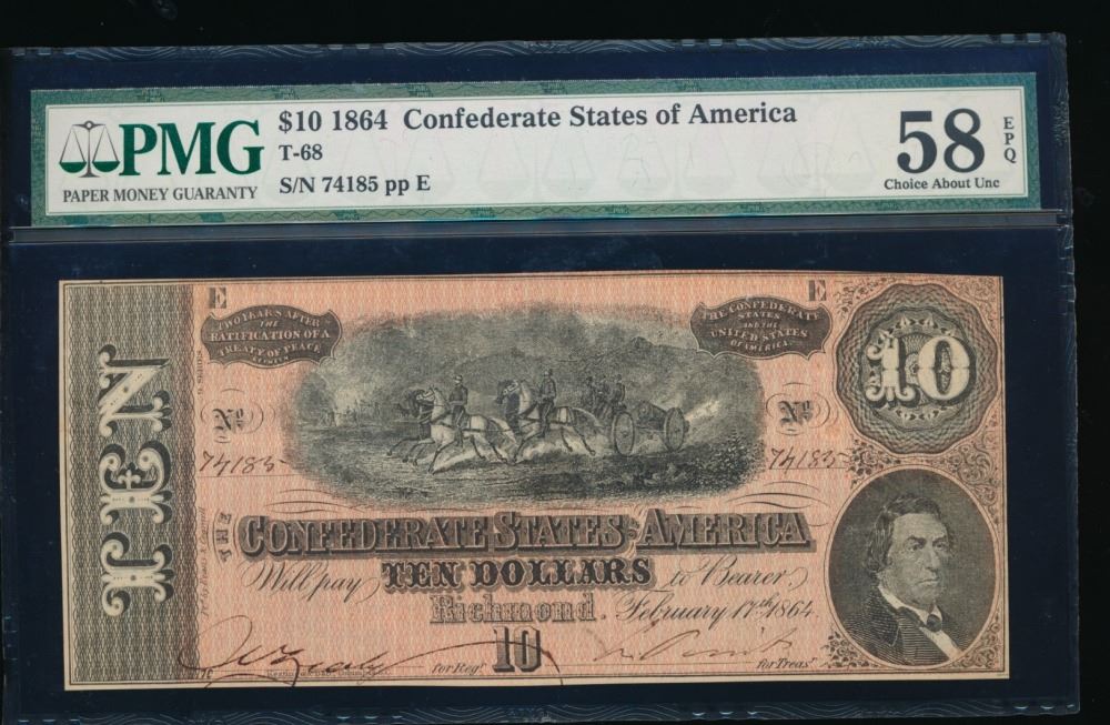 One 1864 $10 T-68 Confederate PMG 58EPQ.
