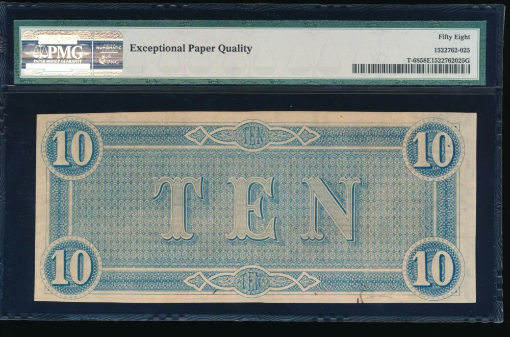 One 1864 $10 T-68 Confederate PMG 58EPQ.