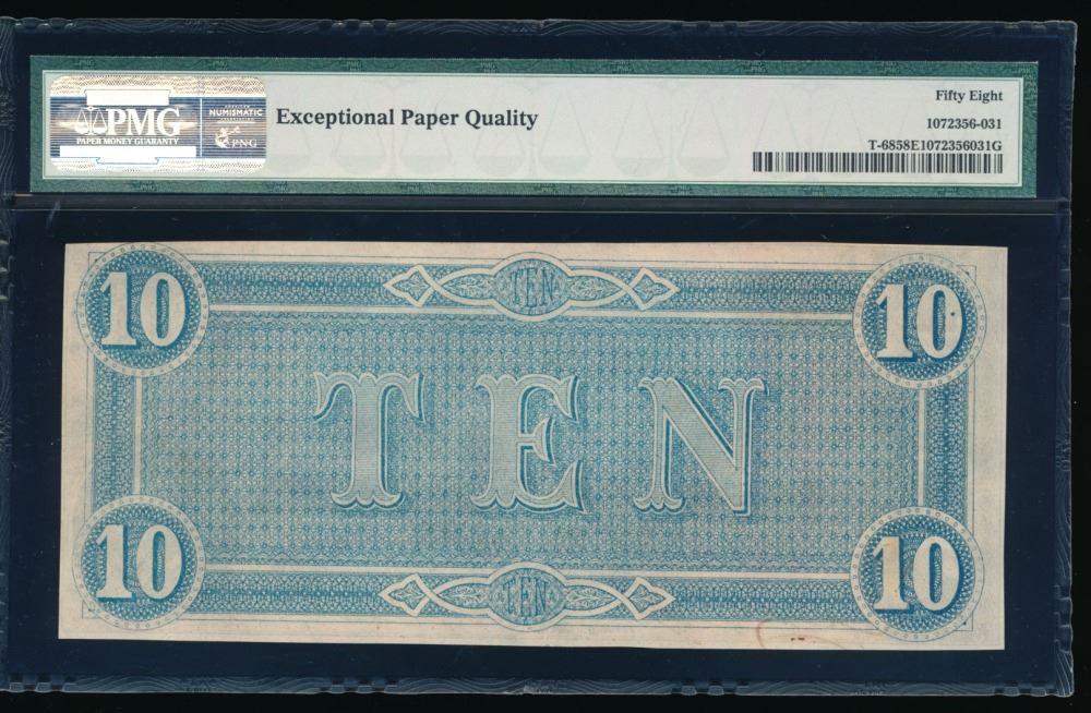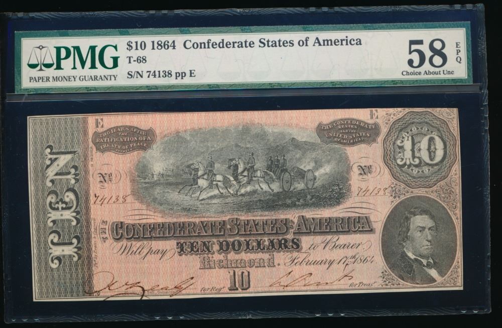 One 1864 $10 T-68 Confederate PMG 58EPQ.