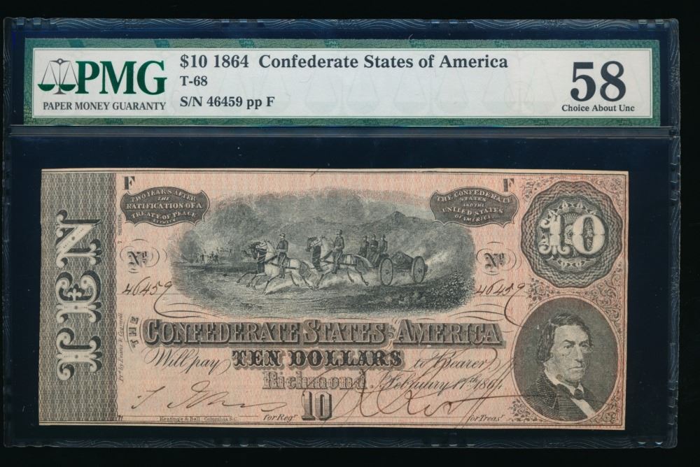 One 1864 $10 T-68 Confederate PMG 58.
