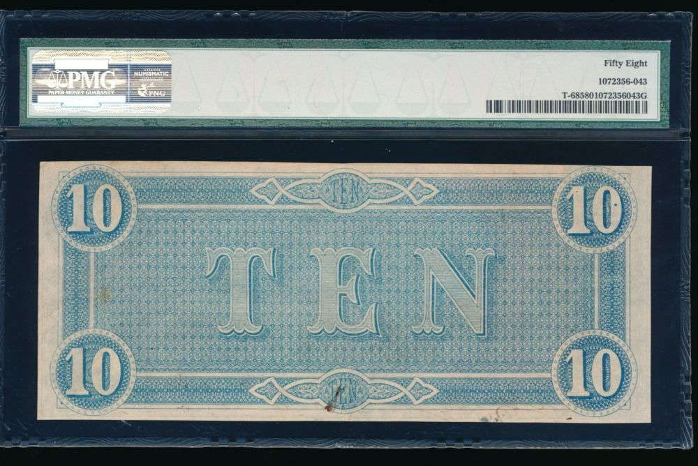 One 1864 $10 T-68 Confederate PMG 58.